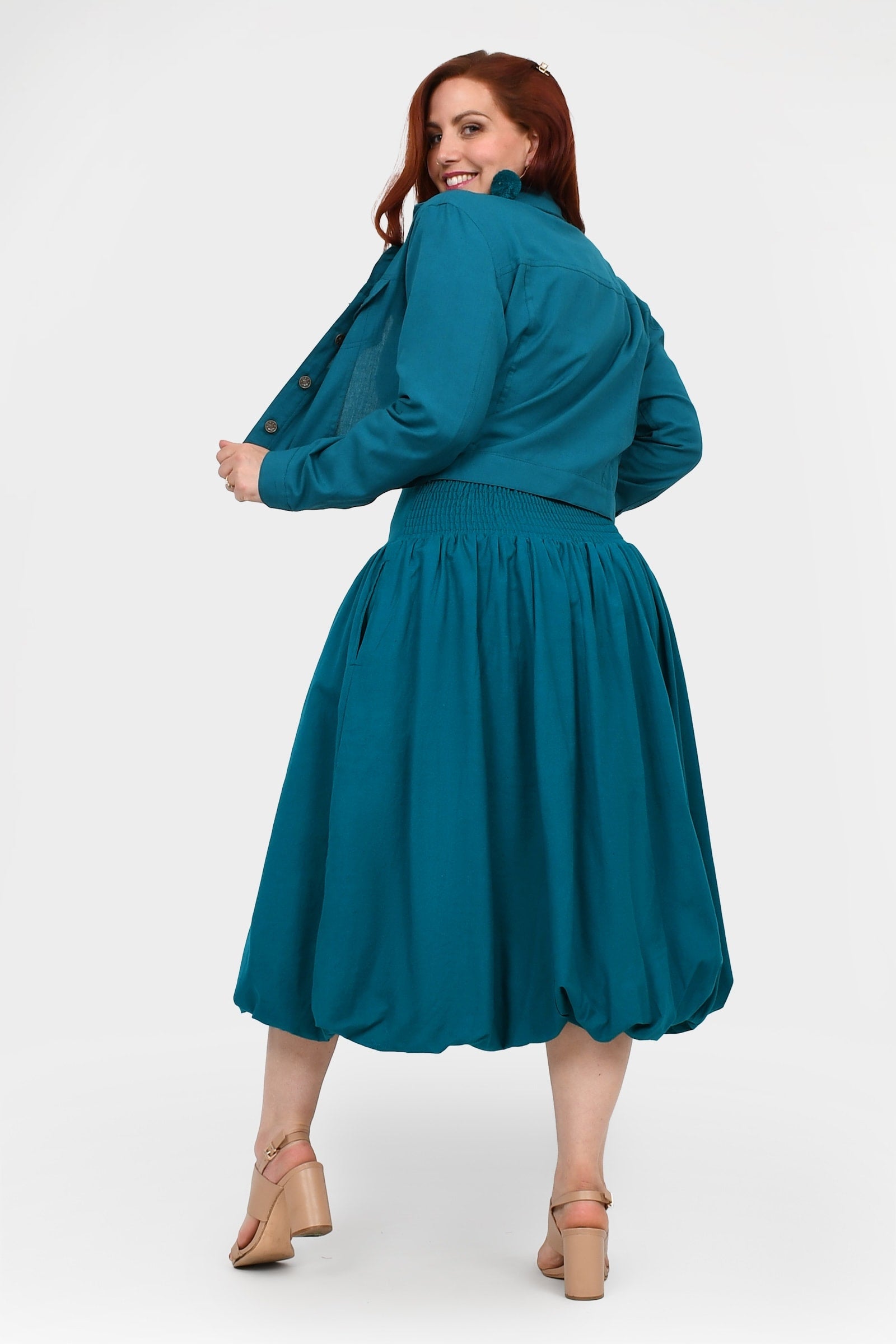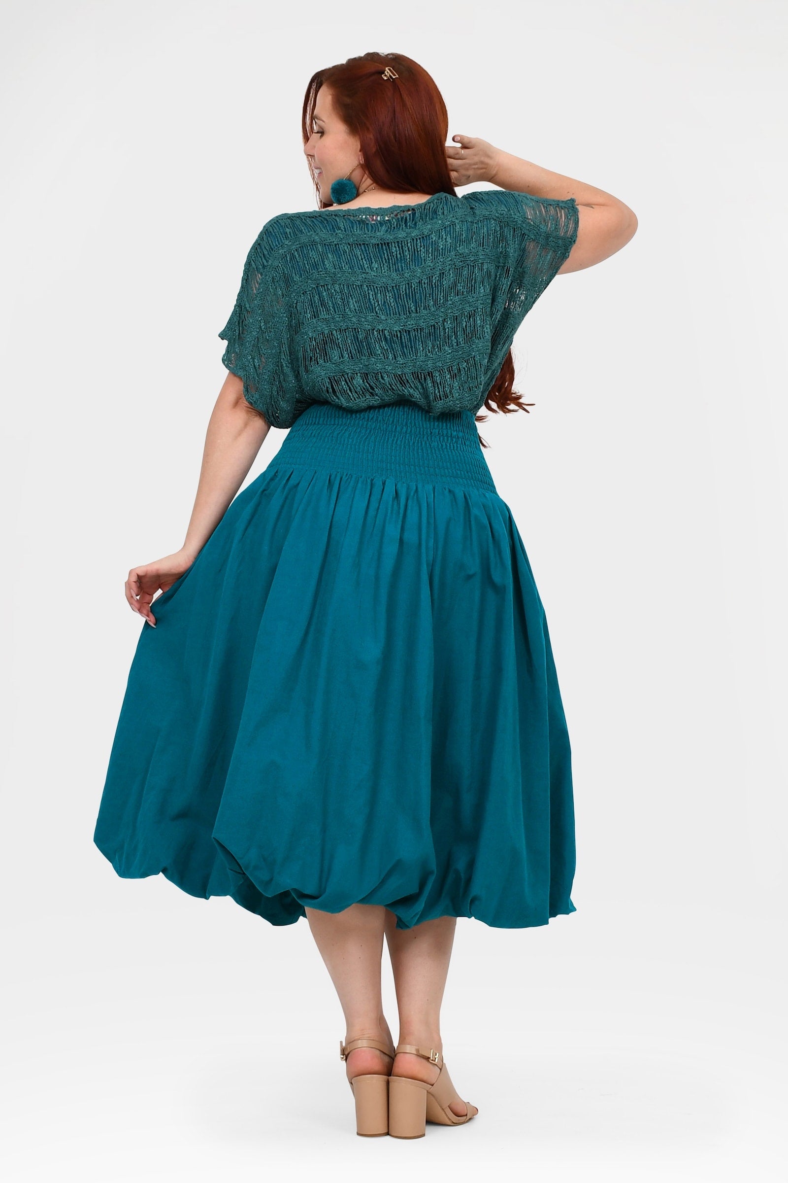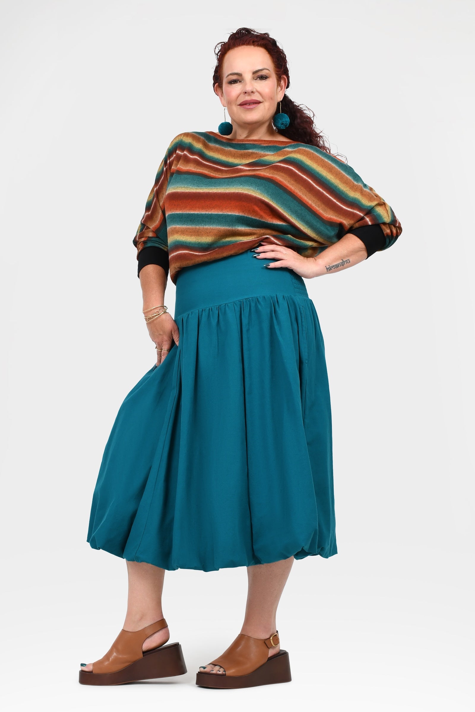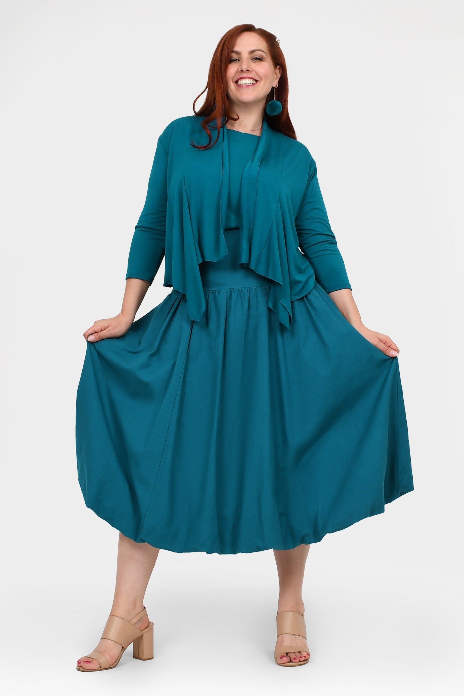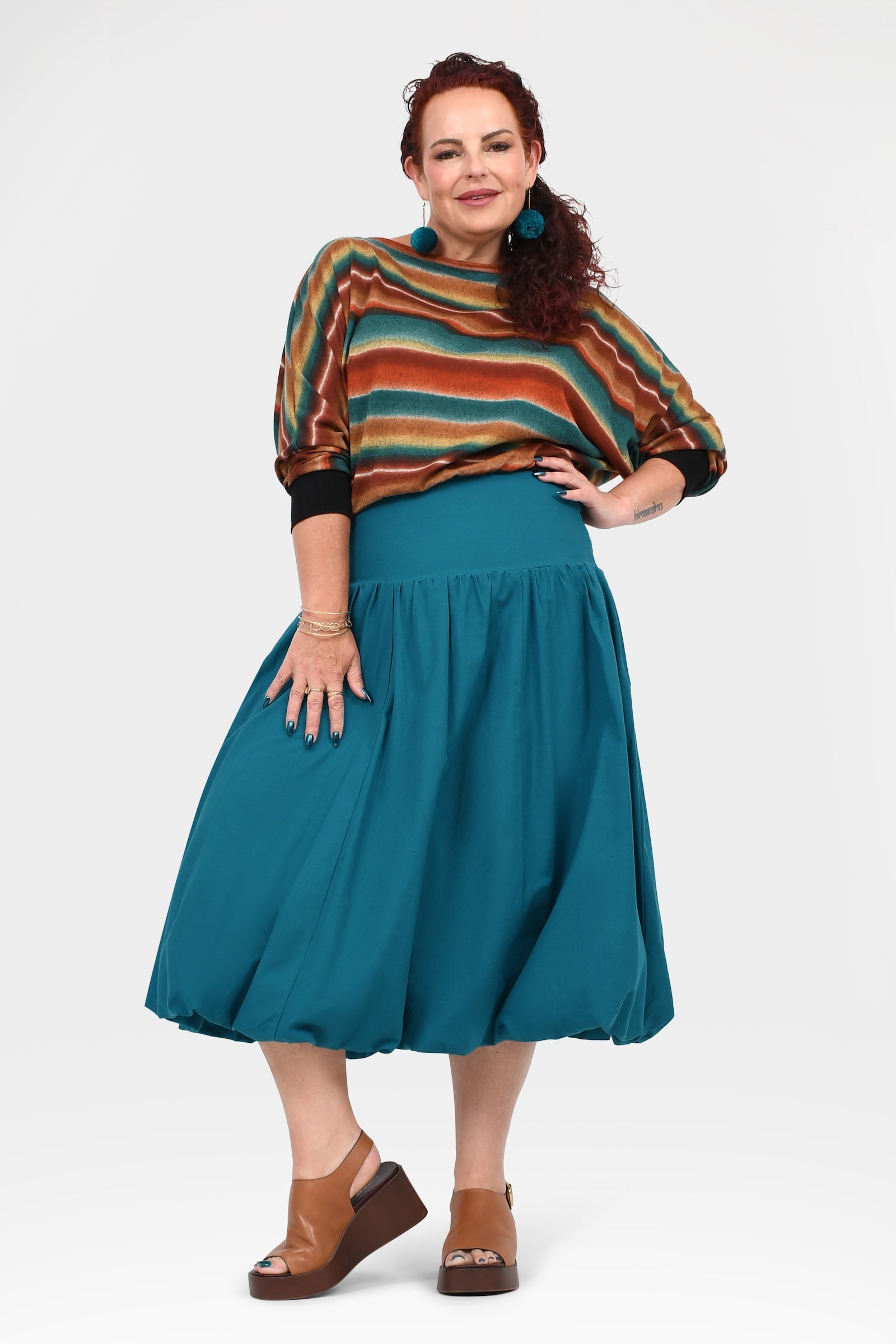 Styling Tip –  Make a statement with the Nora Top in Teal — a bold, playful pop of colour perfect for turning heads. Finish with Pom Pom Earrings in Teal for extra fun and Keshet vibes!