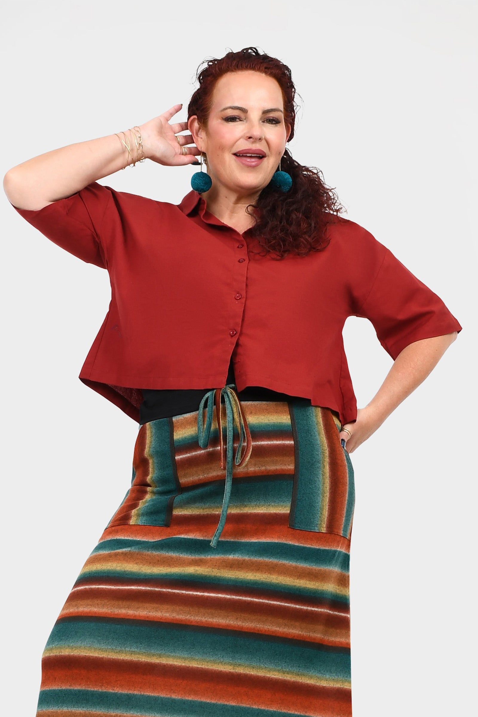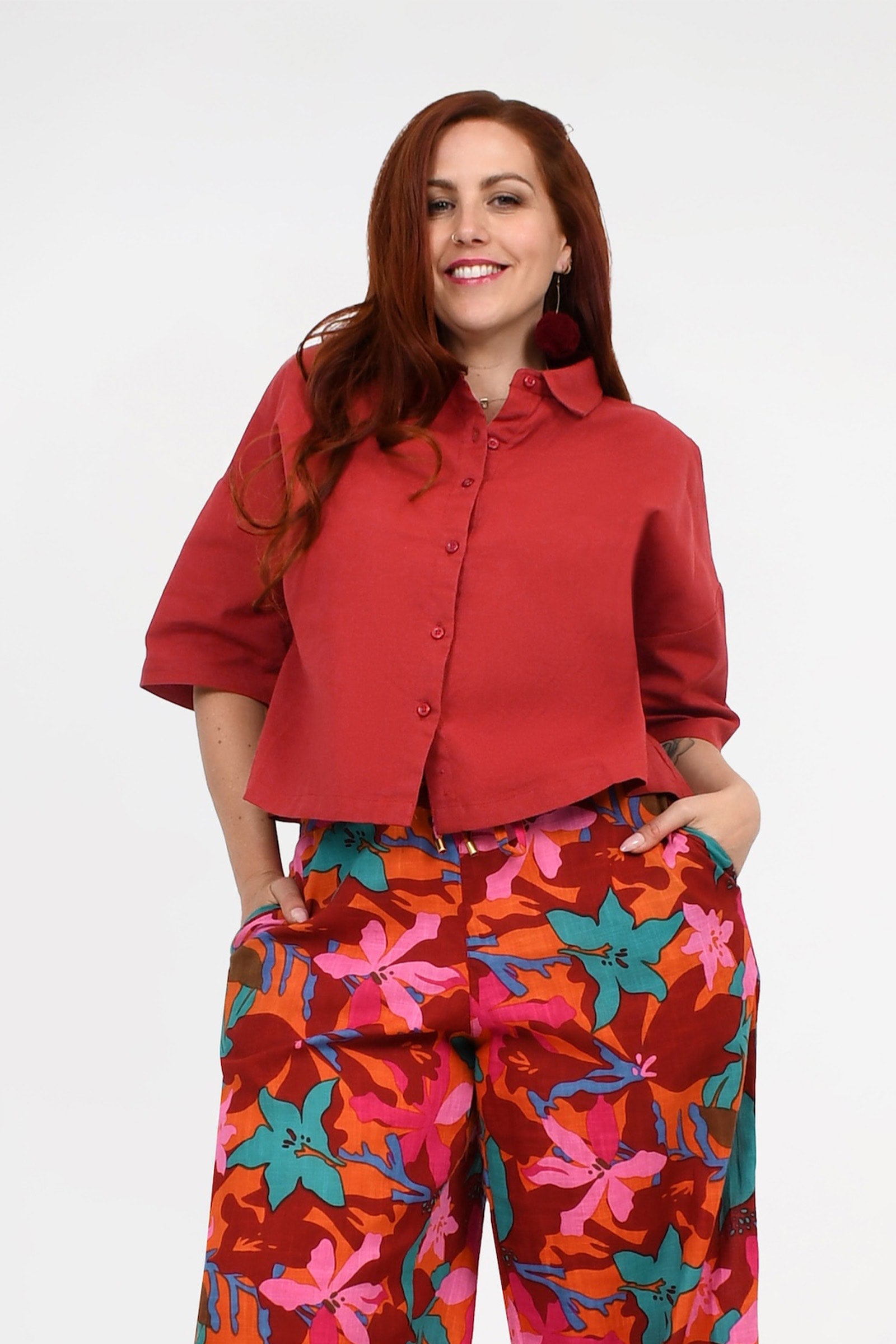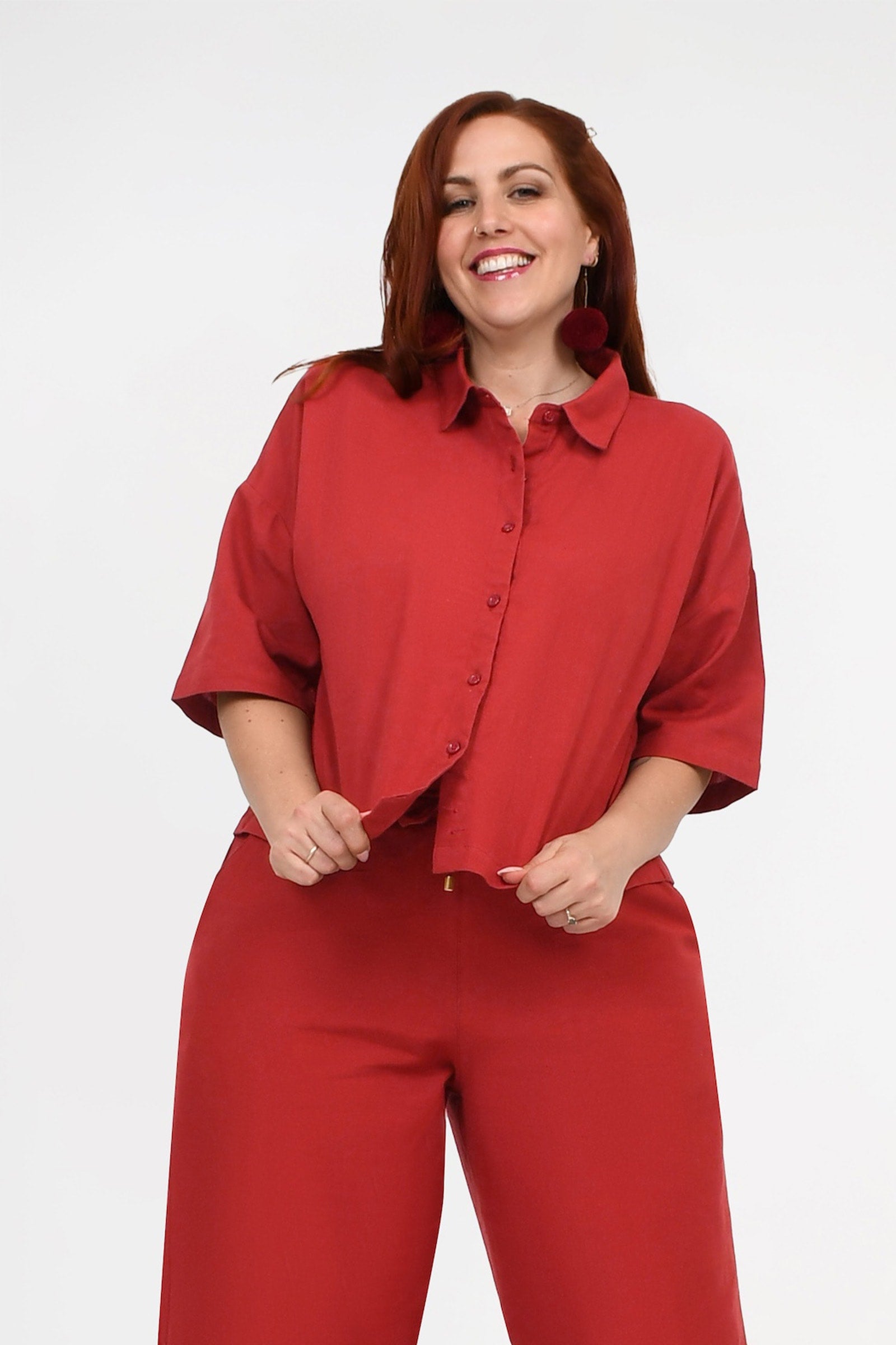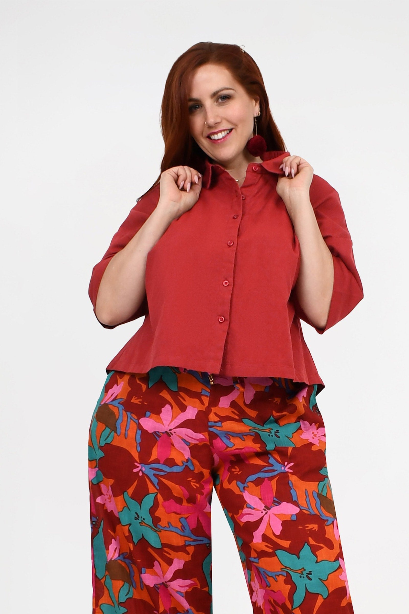 Styling Tip – Pair Willa Shirt with the Una Pants in Dark Red and Pom Pom Earrings in Magenta for an easy, chic outfit that works for brunch, weekend strolls, or casual meet-ups. She’s simple, stylish, and totally versatile!