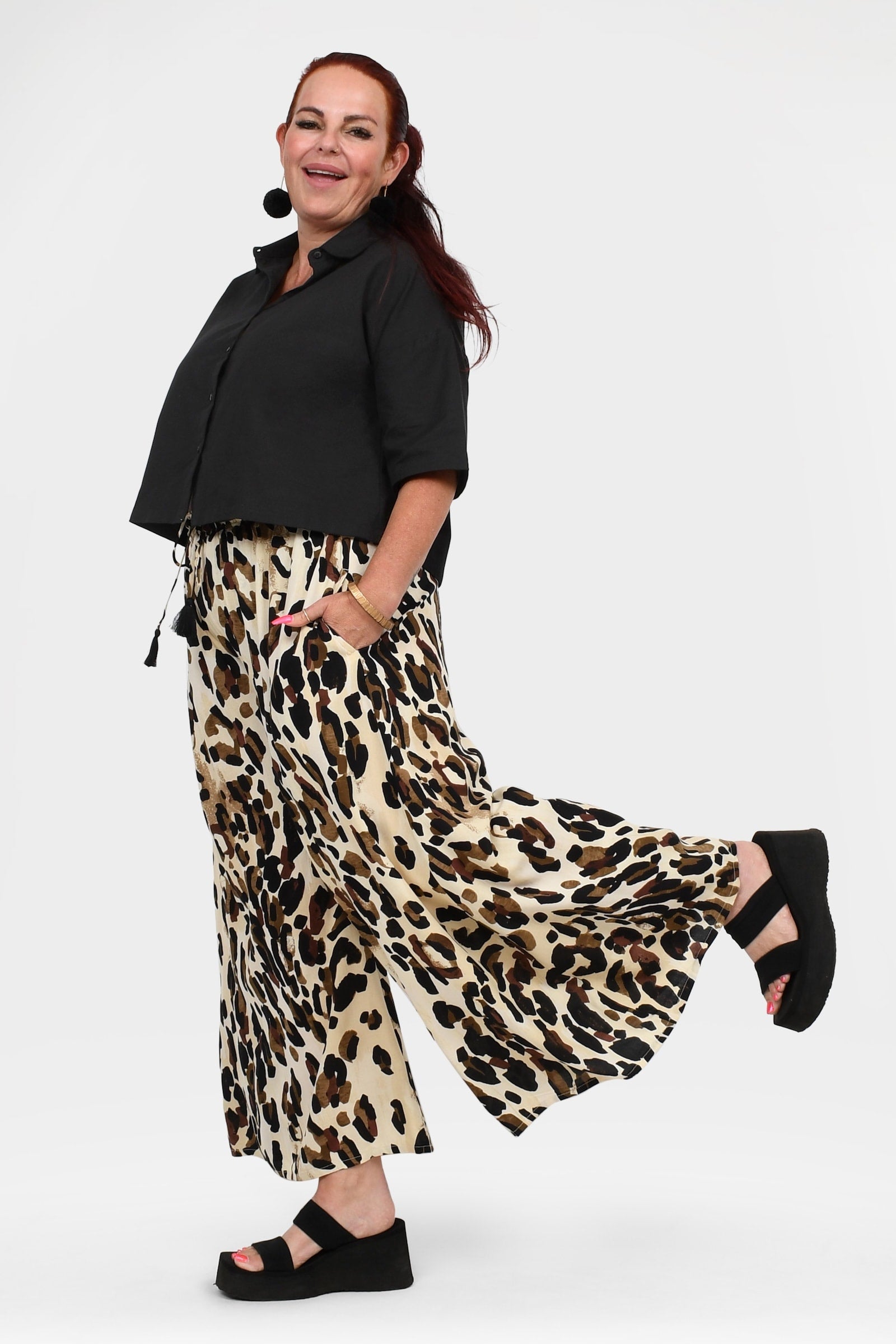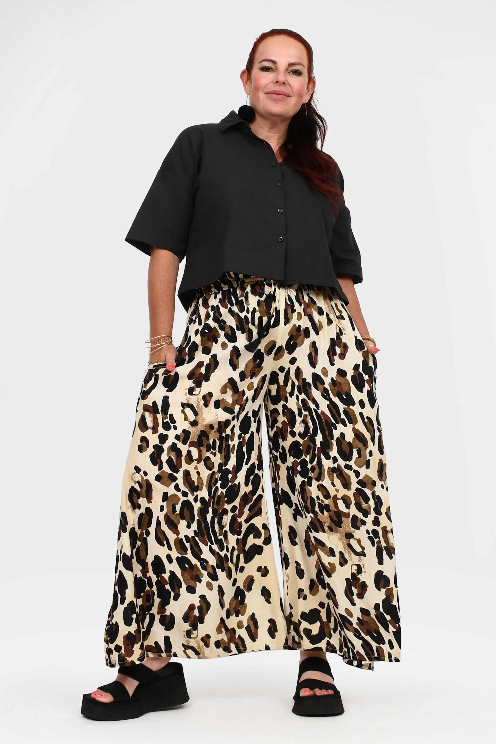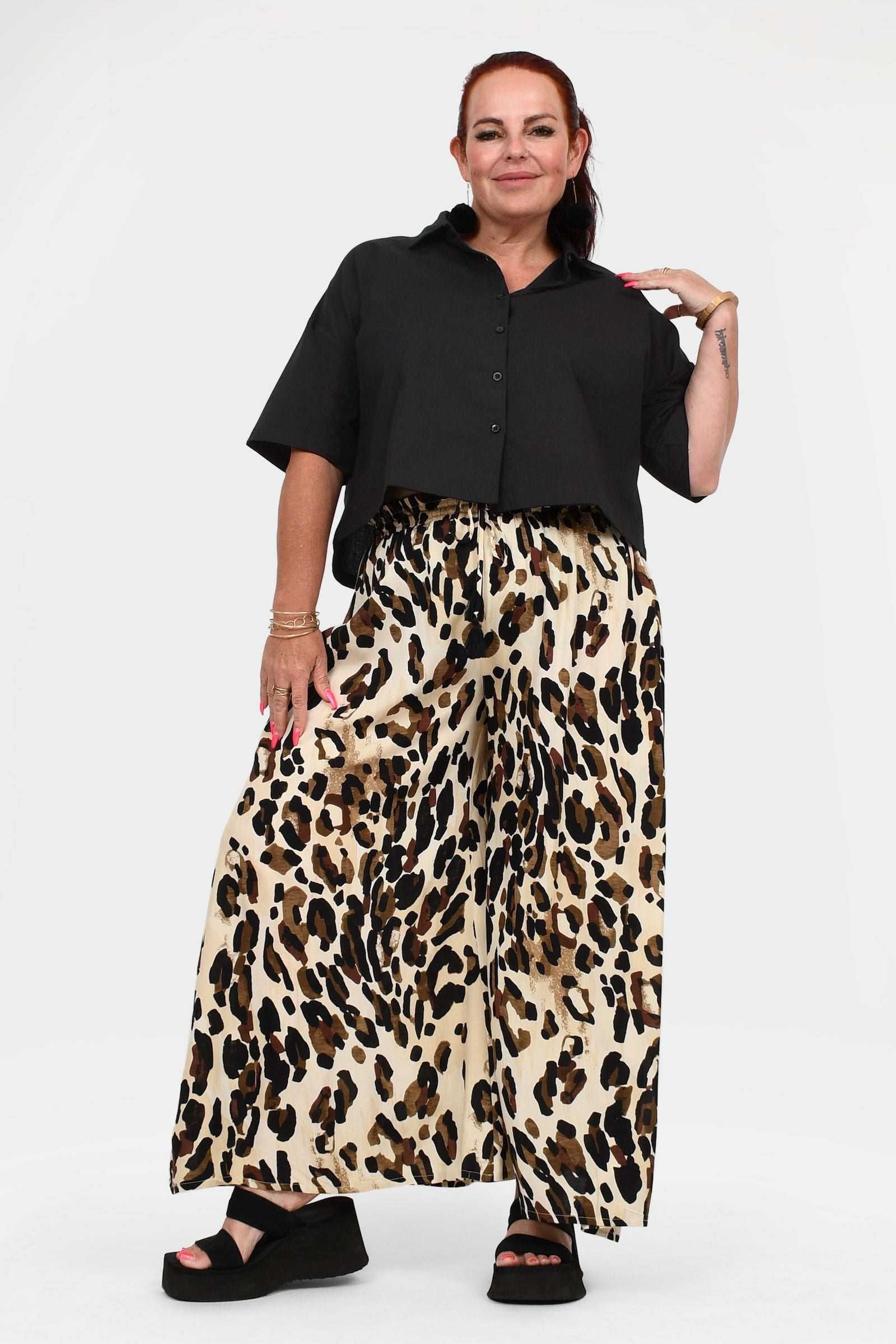 - Flowy wide legs combined with a comfy elastic waistband create an effortlessly stylish and comfortable look that lasts all day long.
