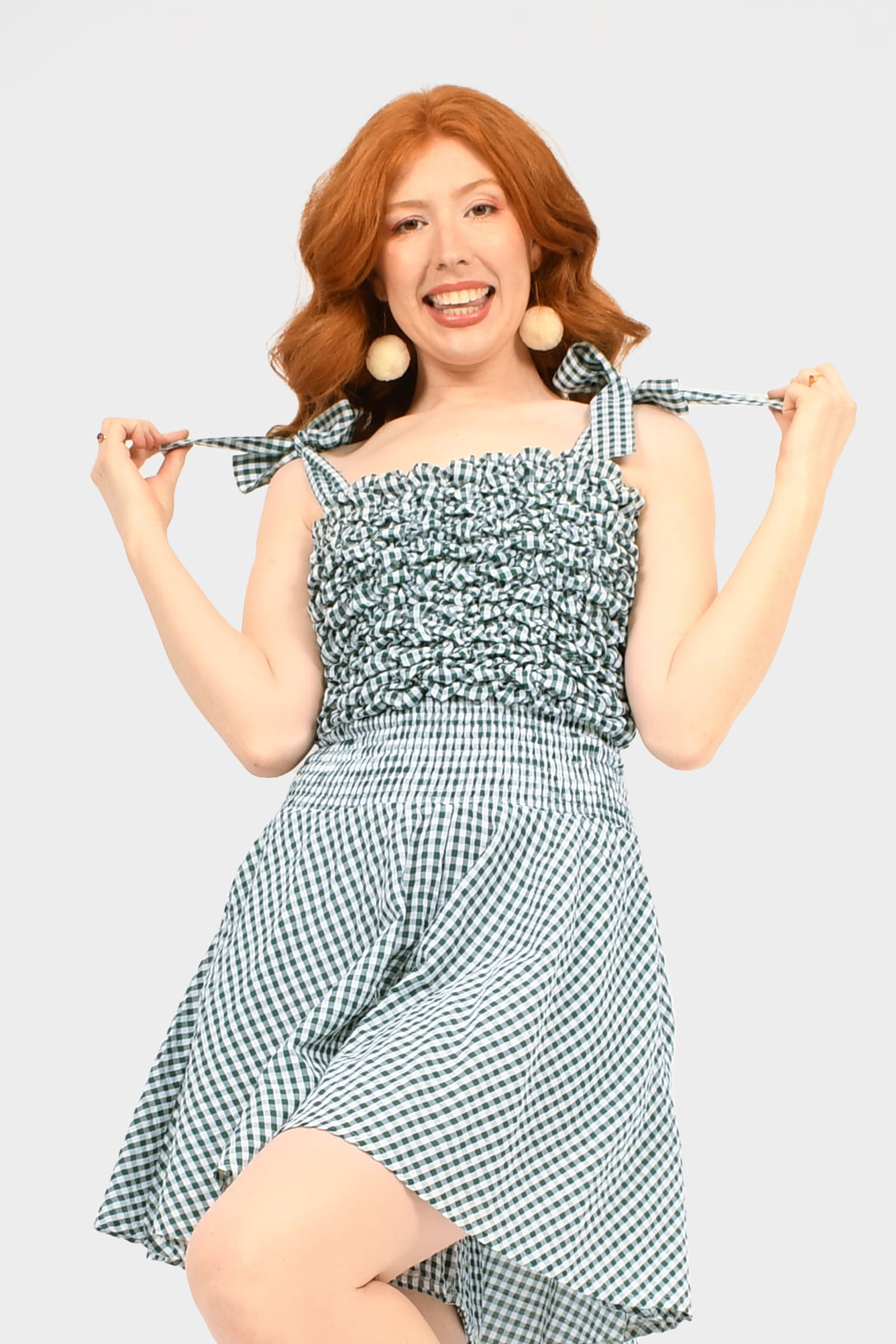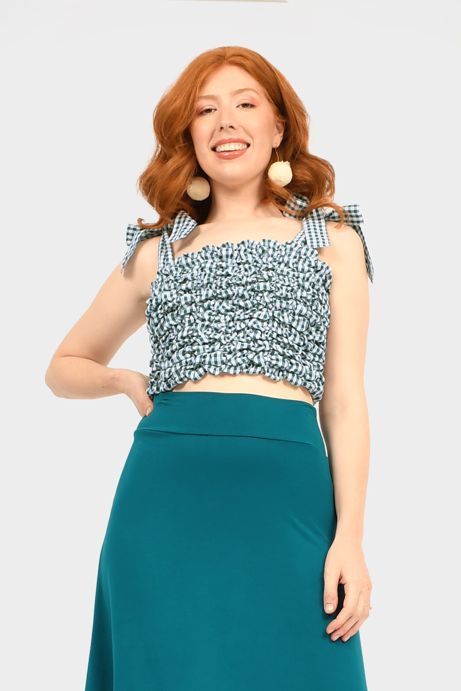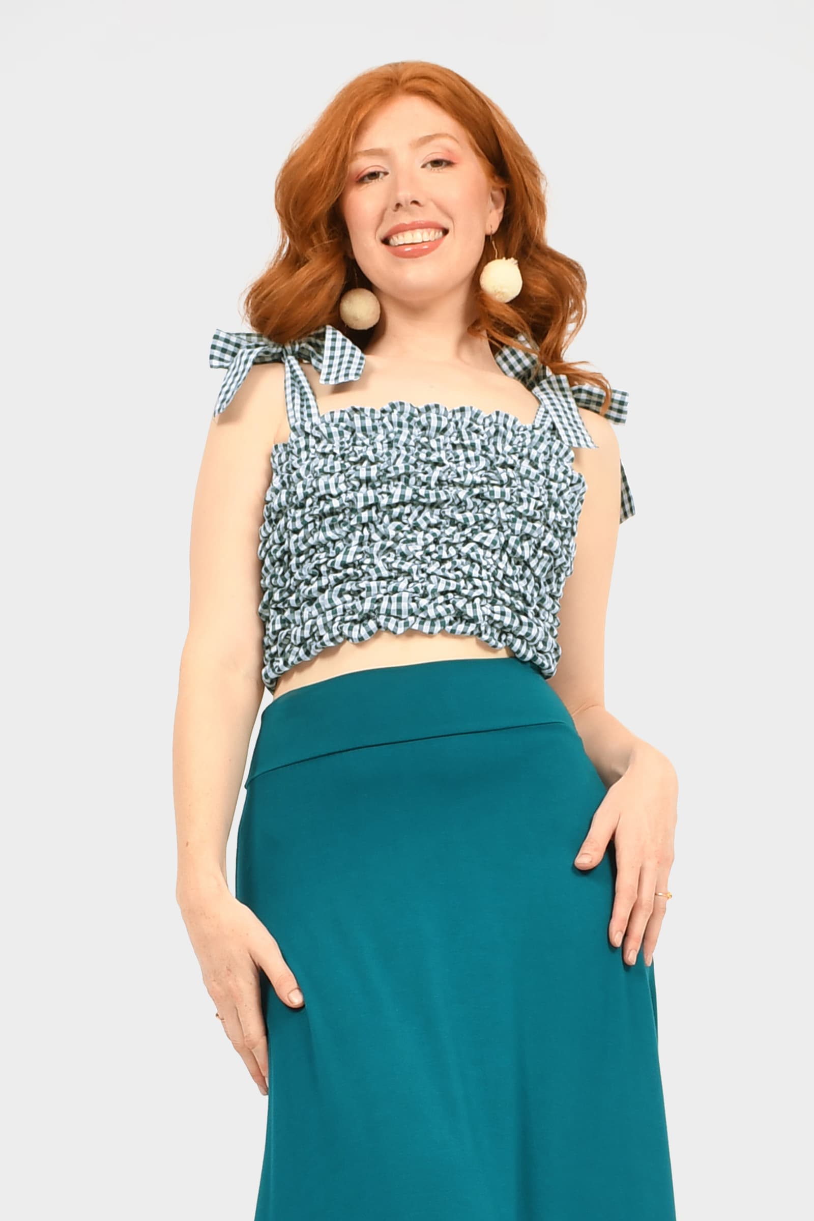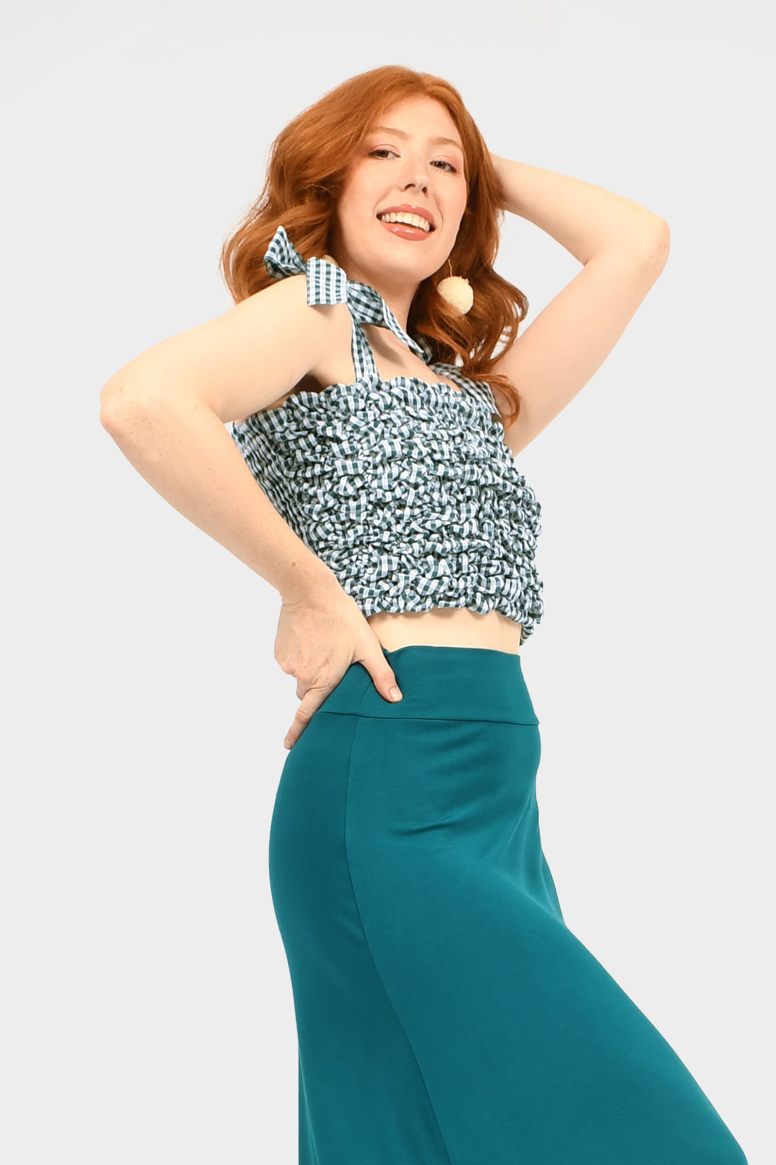 Sophia wears size S/M in Gingham Teal, is 175cm tall and is standard AU size 8.