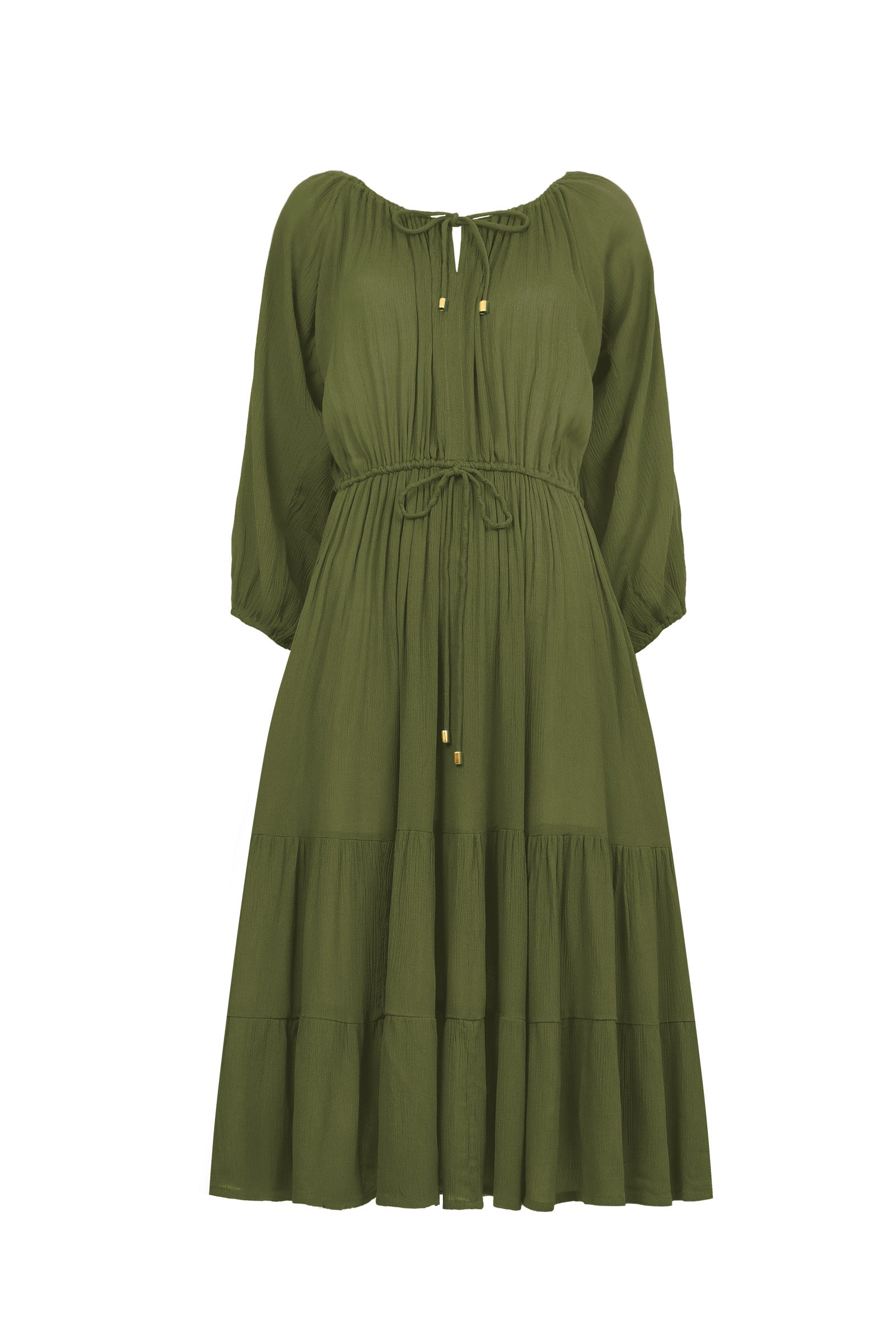 Designed with long sleeves and elasticated cuffs, this beauty features a drawstring V-neckline, a beautifully tiered midi skirt and a cinch-able drawstring waist for a fit that’s both relaxed and flattering.
