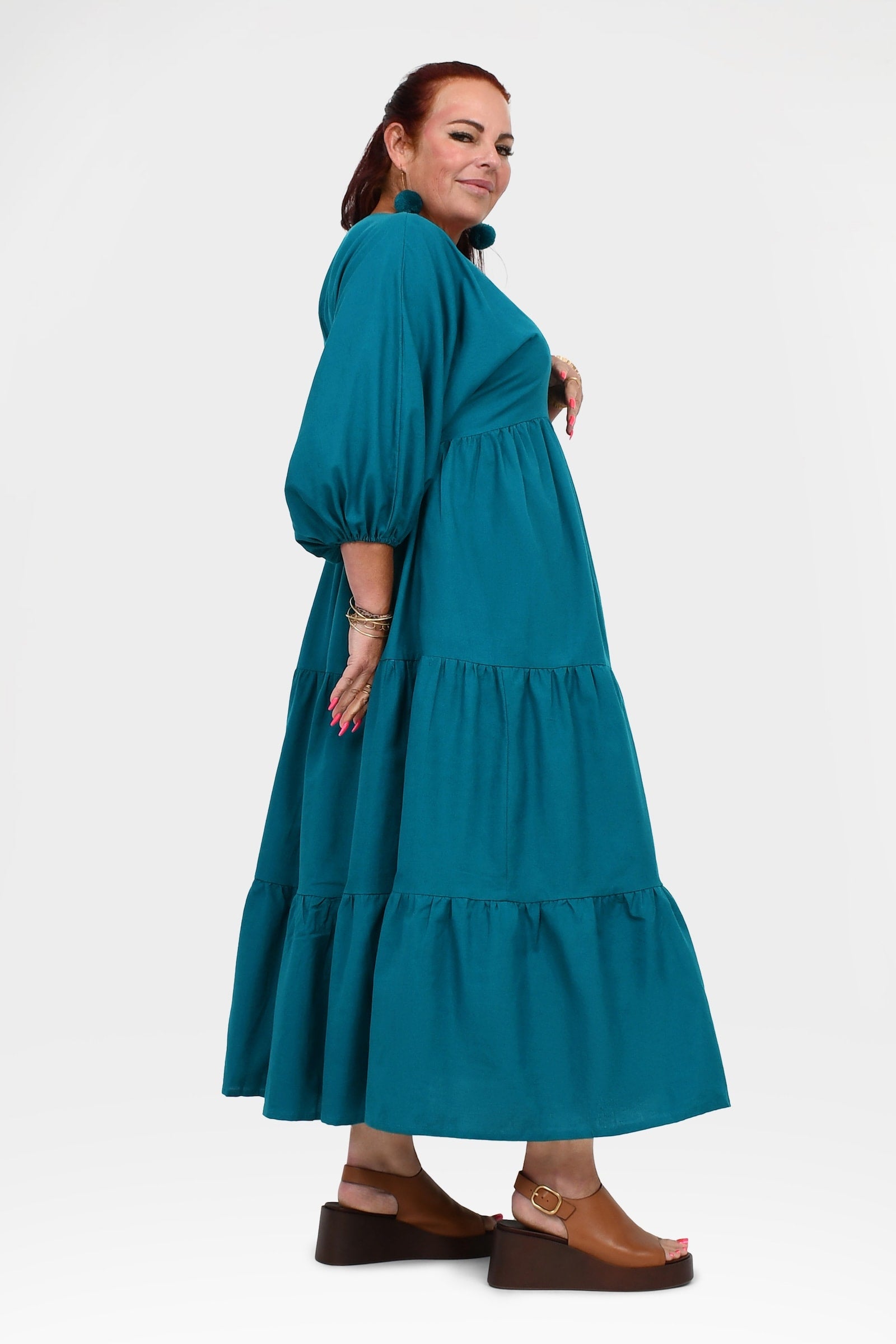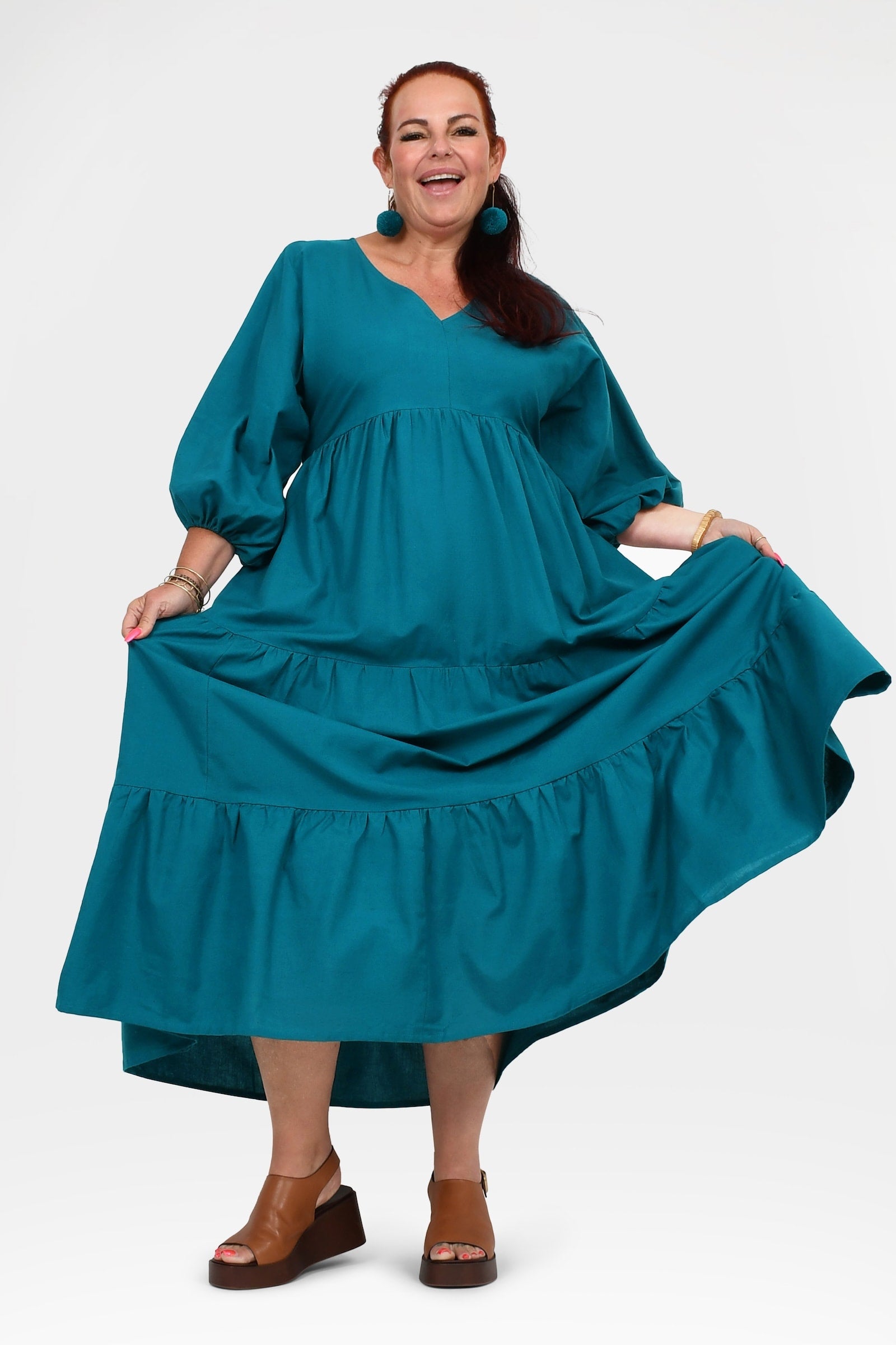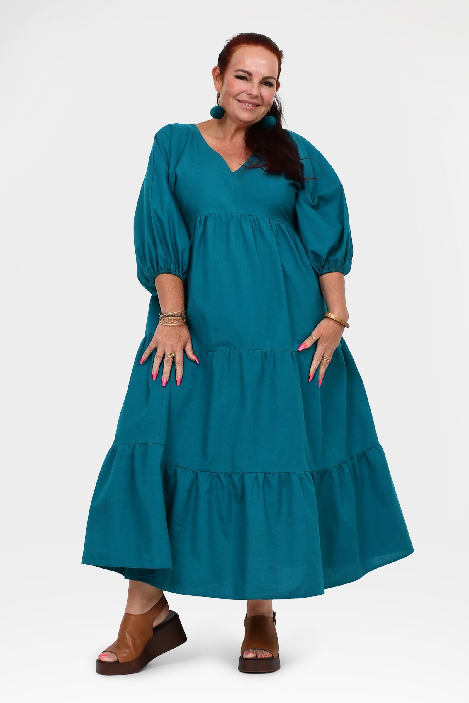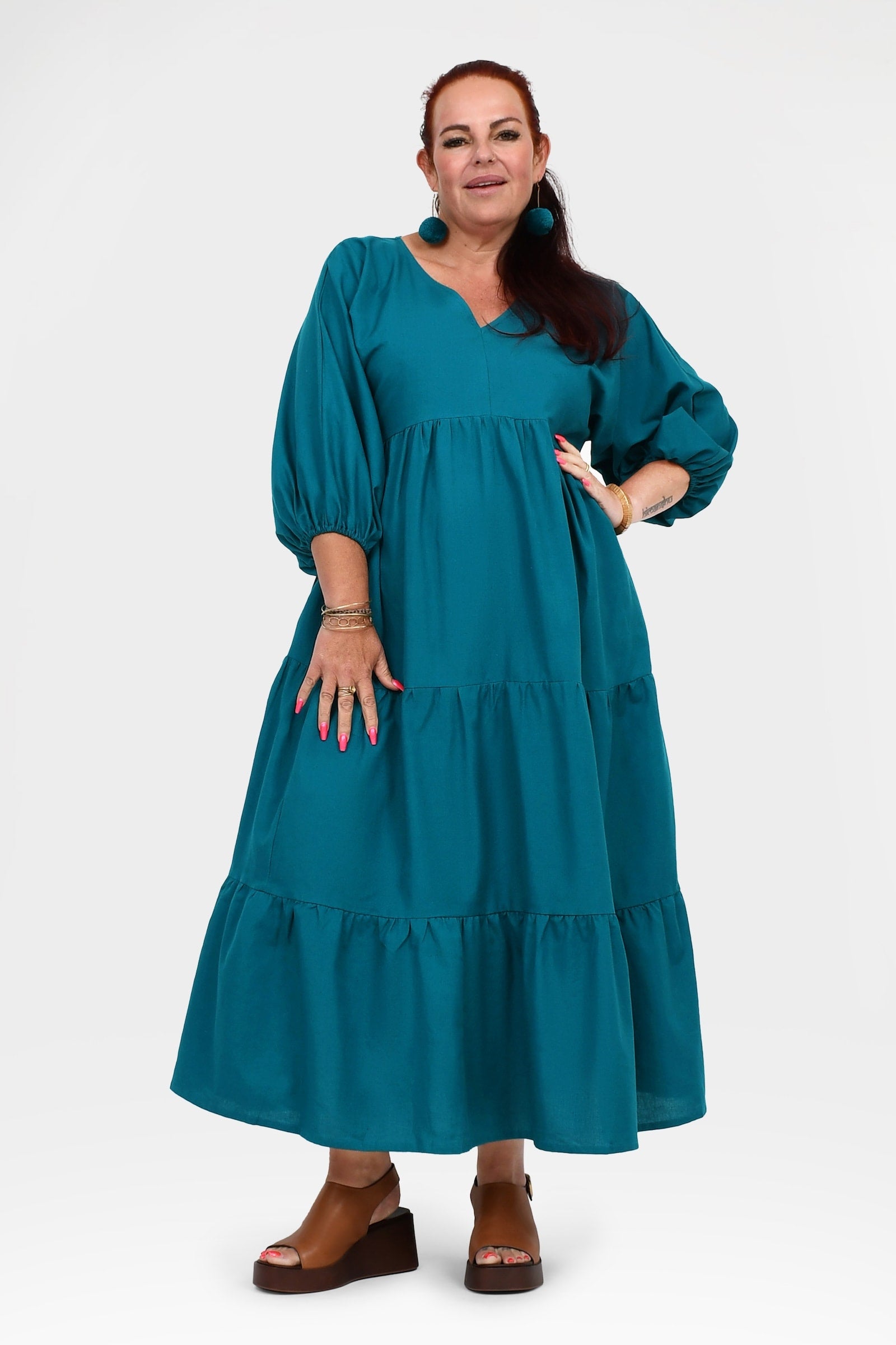 Styling Tip – Let Bellamy shine with statement Pom Pom Earrings in Teal and leather sandals in brown or black for daytime events, or elevate her with heels, a Denim Jacket, and bold accessories for weddings, parties, or sunset dinners. She’s the kind of dress that turns heads everywhere you go!