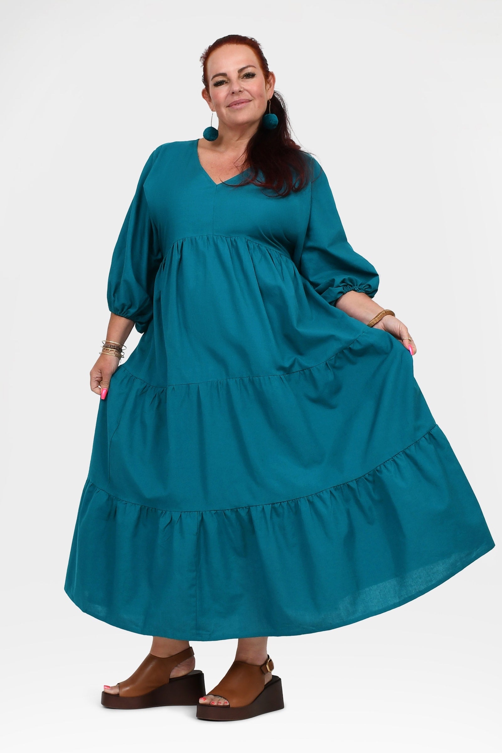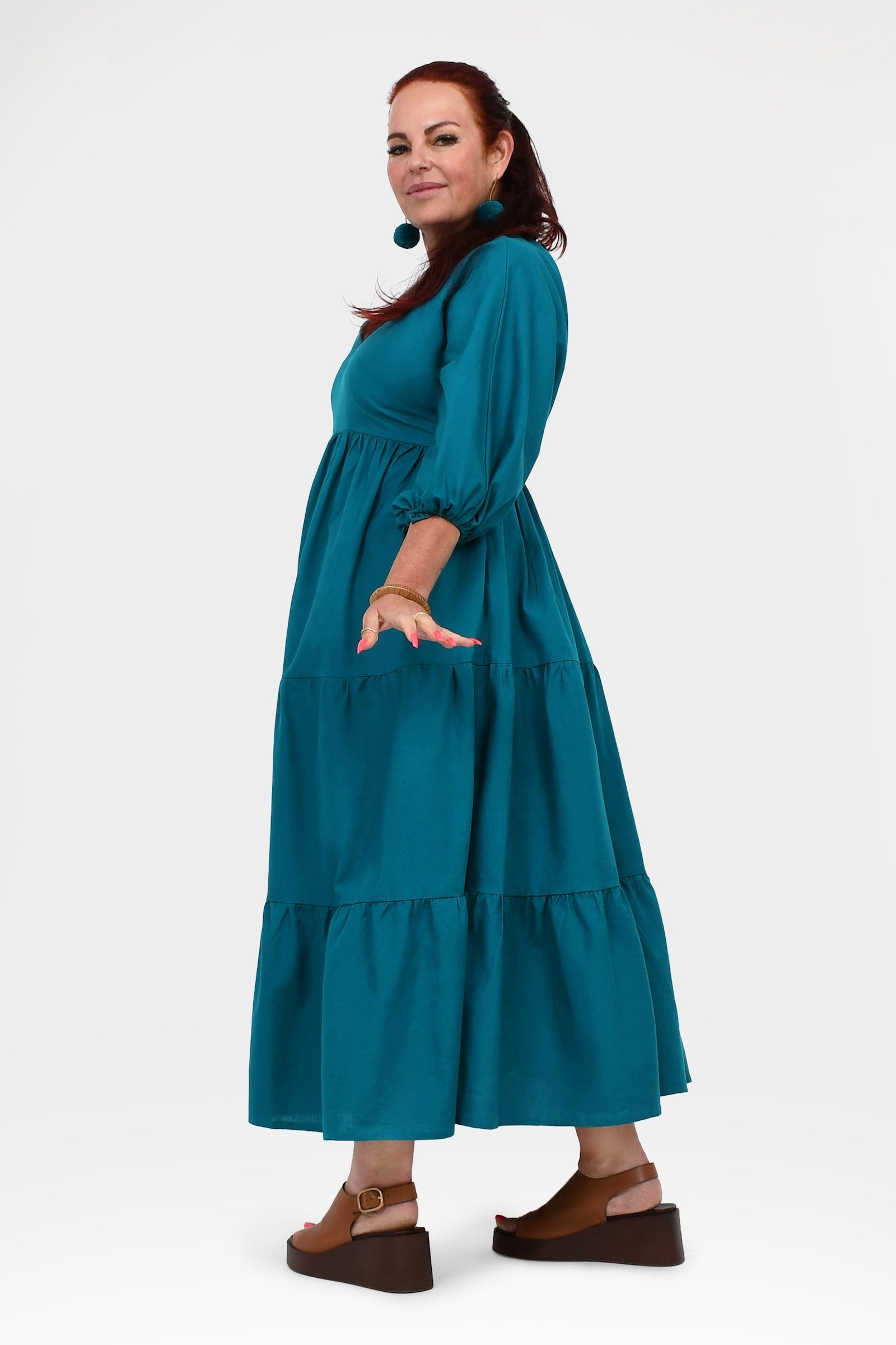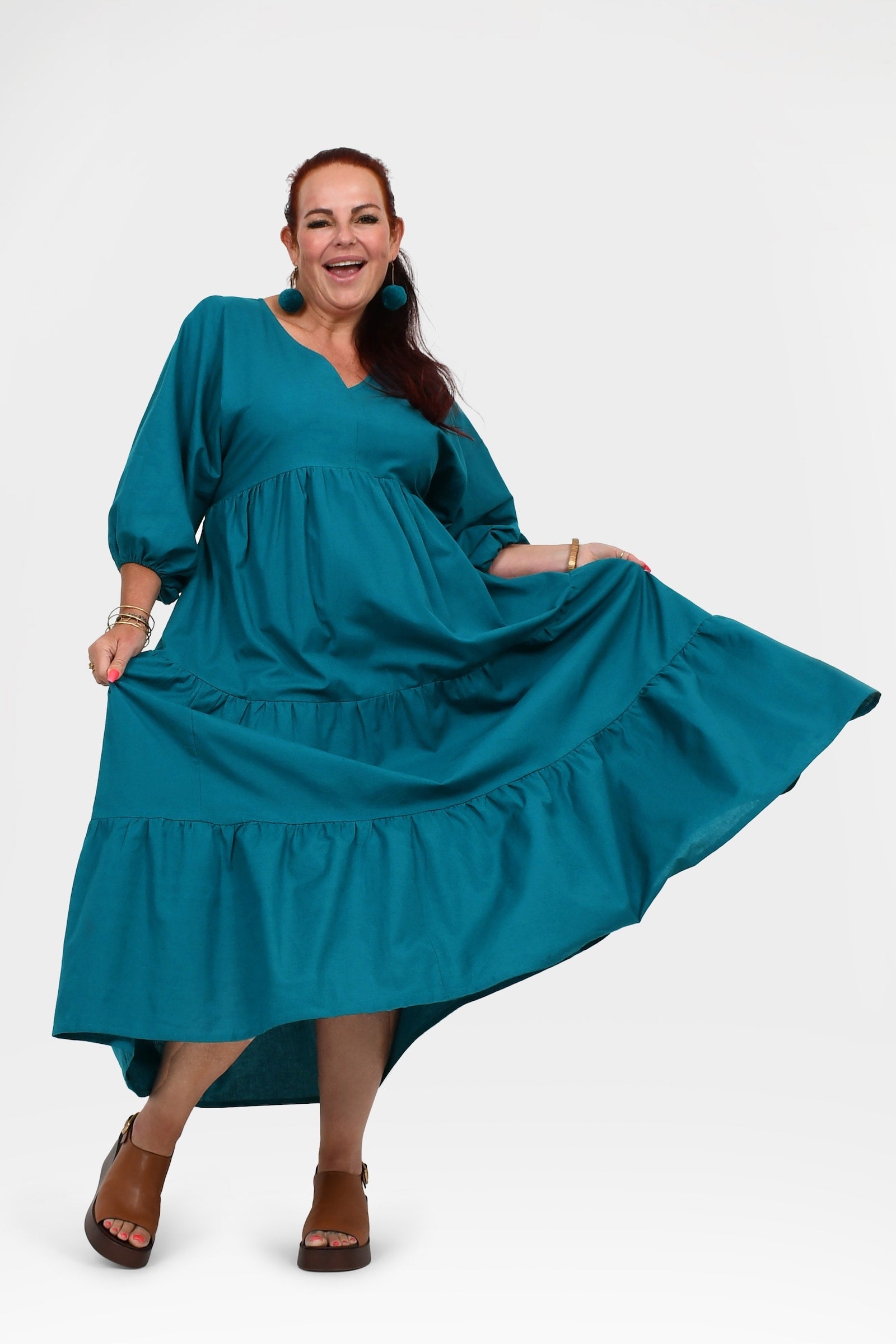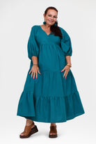 Styling Tip – Let Bellamy shine with statement Pom Pom Earrings in Teal and leather sandals in brown or black for daytime events, or elevate her with heels, a Denim Jacket, and bold accessories for weddings, parties, or sunset dinners. She’s the kind of dress that turns heads everywhere you go!