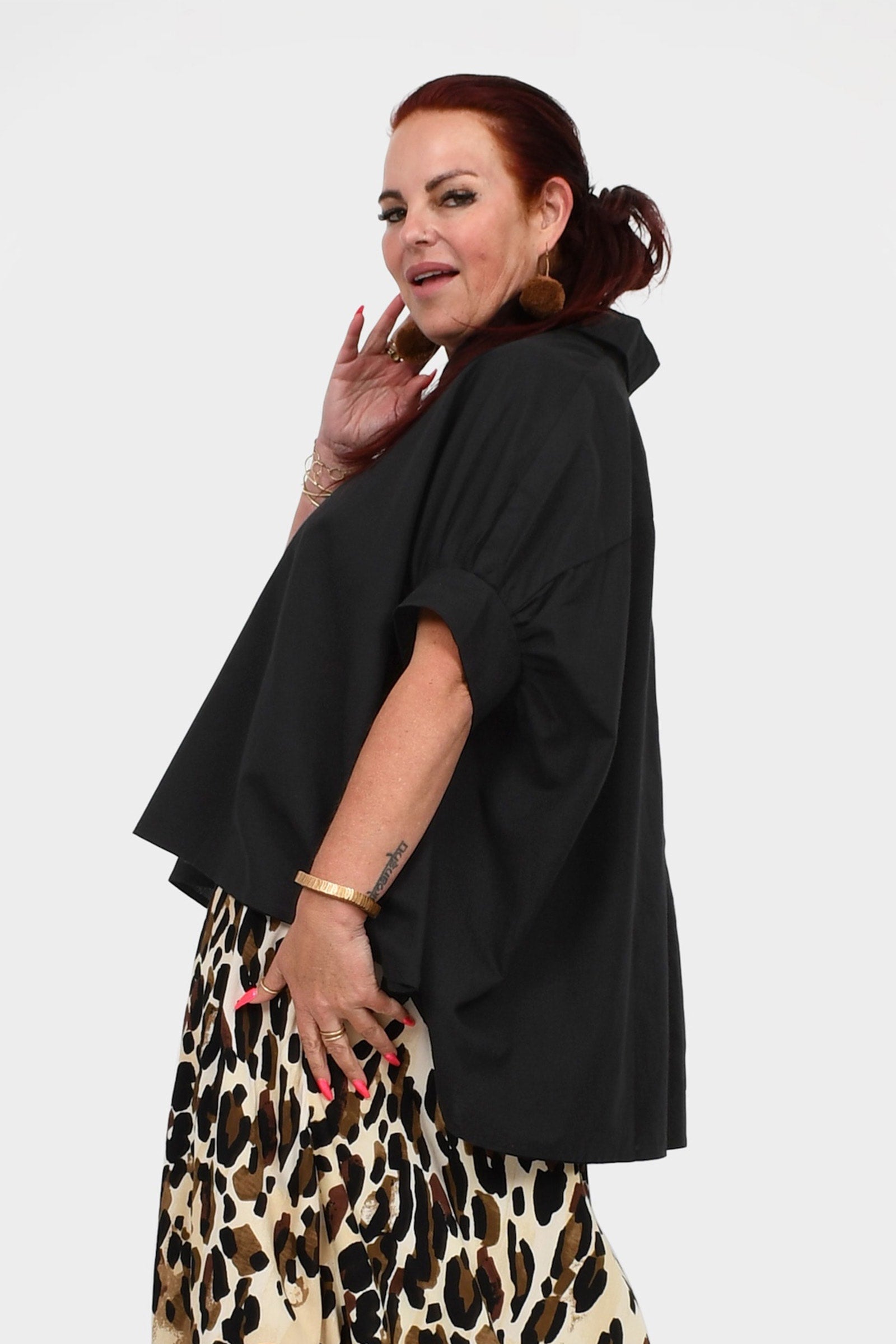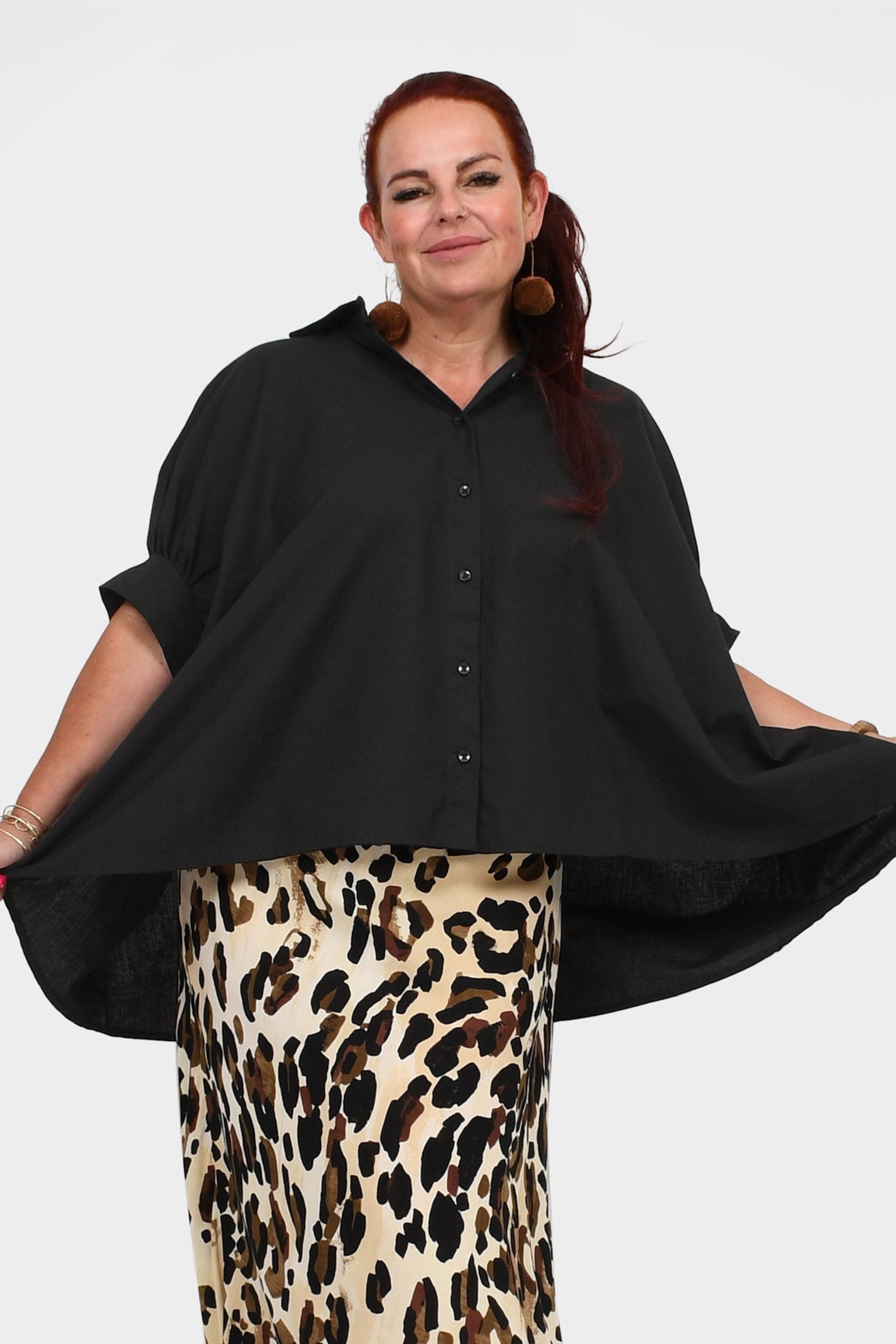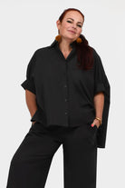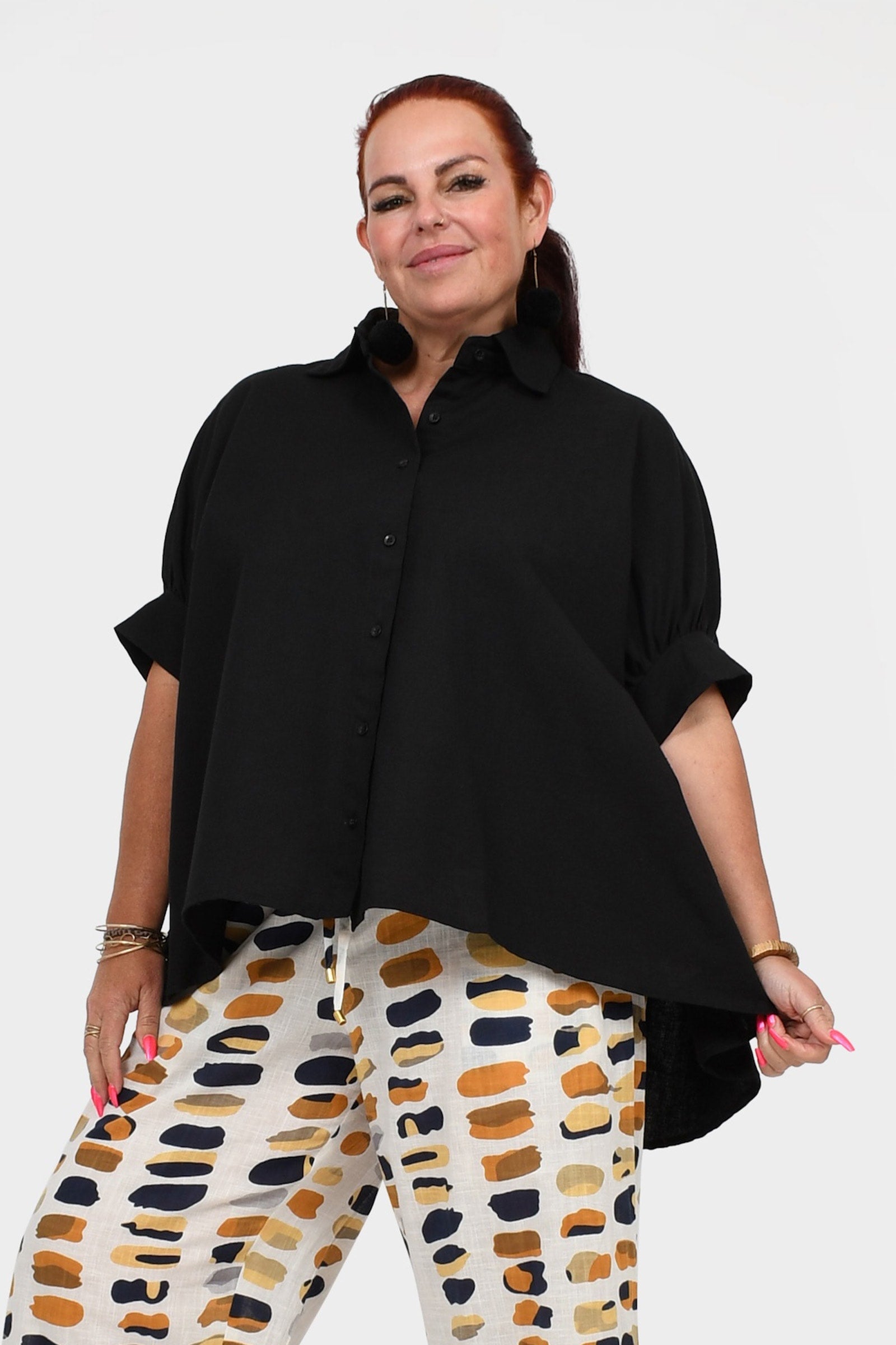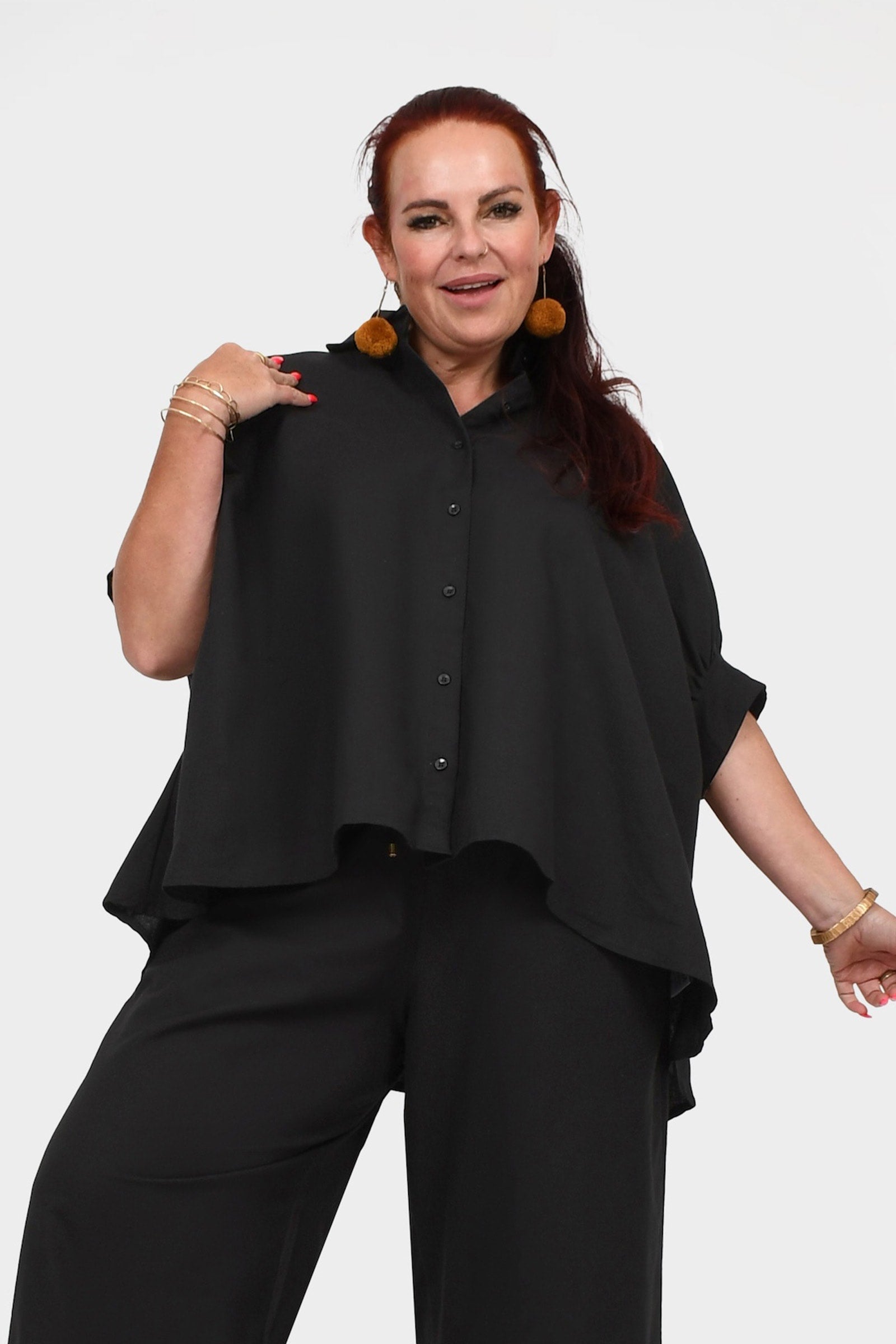 Styling Tip – Pair Suki Shirt Top with our statement Pom Pom Earrings in Gold and the Una Pants in Black finished with black sandals for a daytime-ready look. She’s perfect for casual brunches, workdays, or weekend strolls!