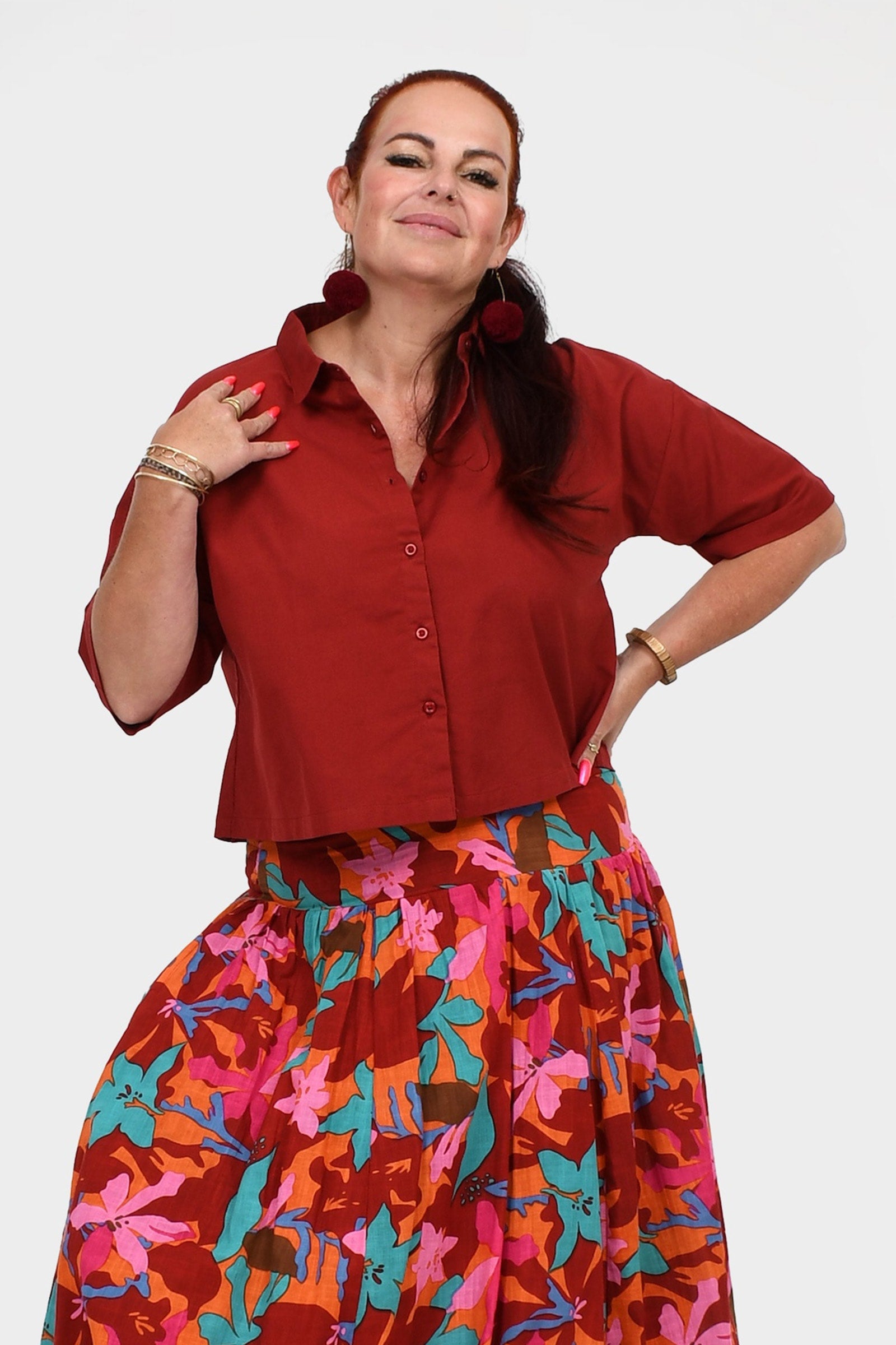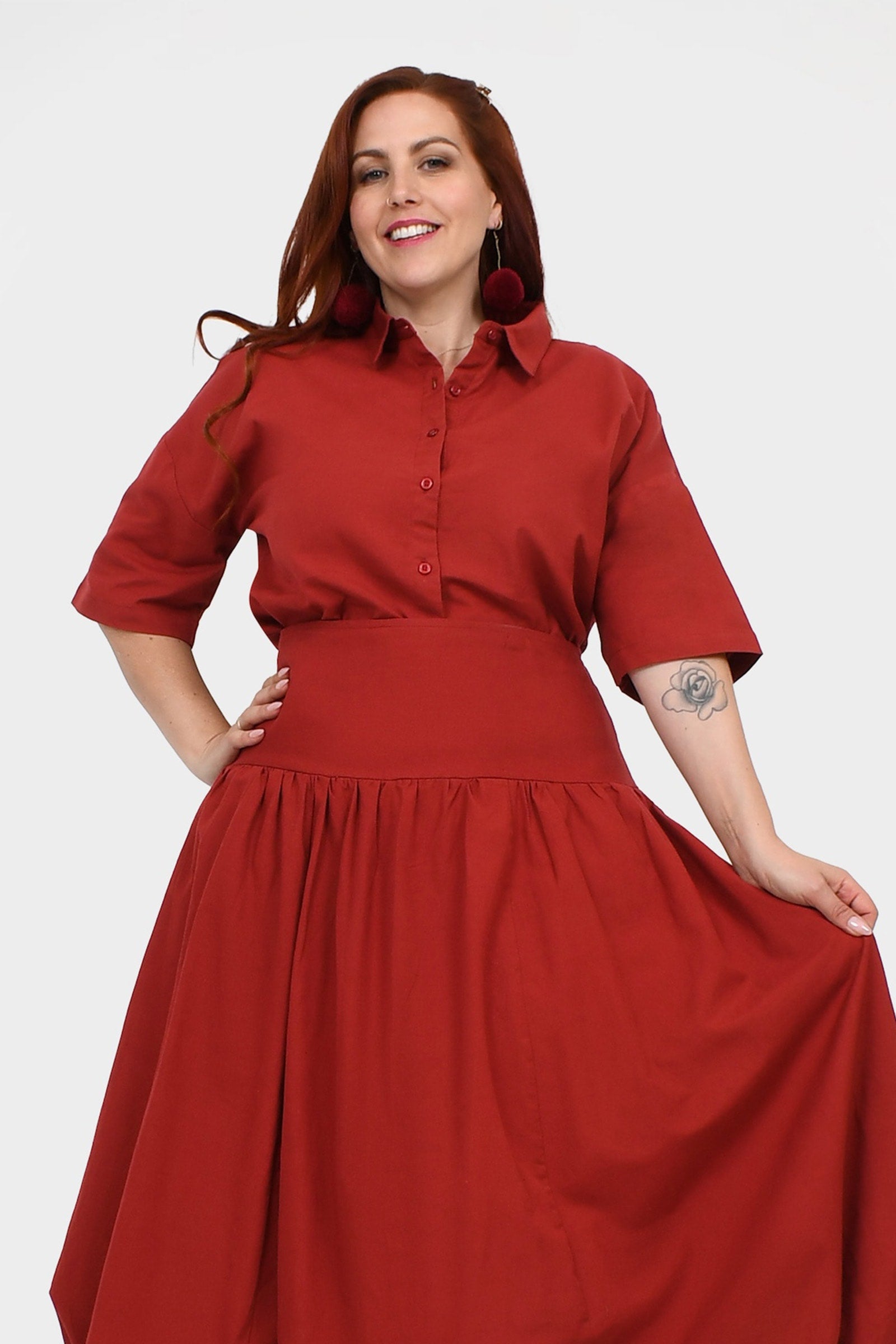 Styling Tip – Pair Willa Shirt with the Una Pants in Dark Red and Pom Pom Earrings in Magenta for an easy, chic outfit that works for brunch, weekend strolls, or casual meet-ups. She’s simple, stylish, and totally versatile!
