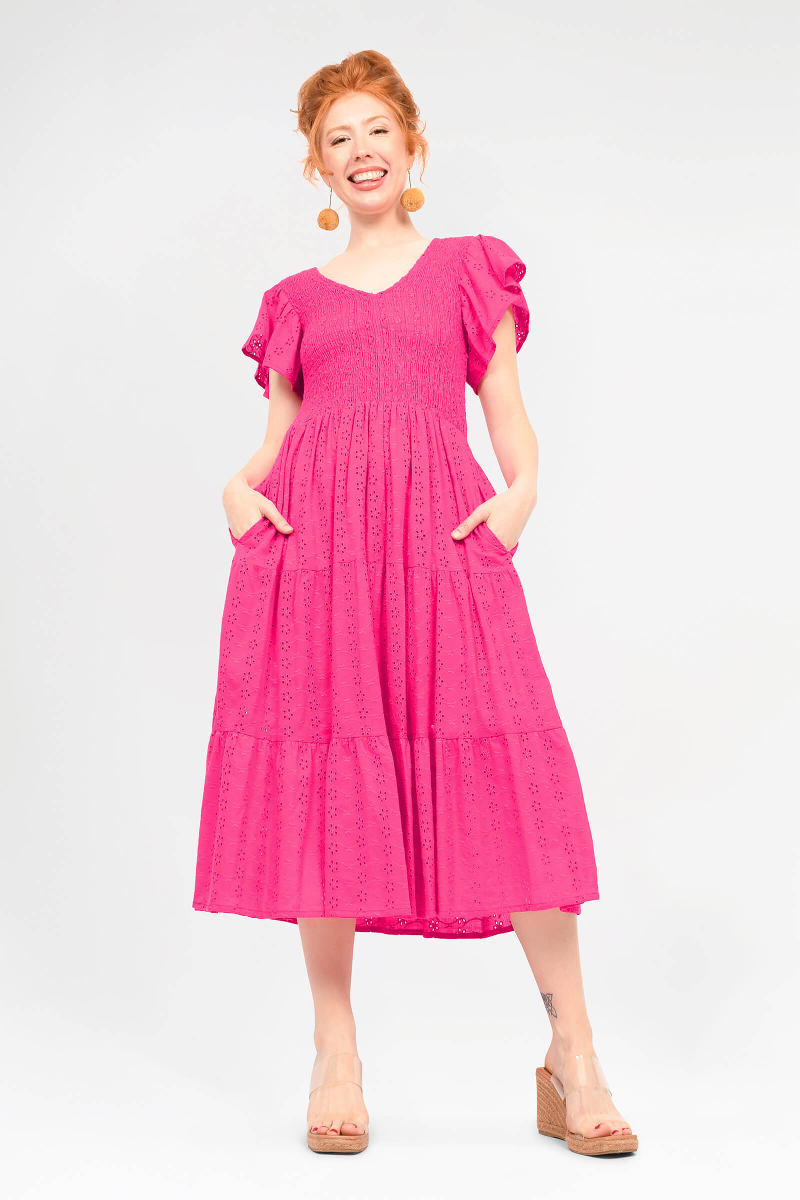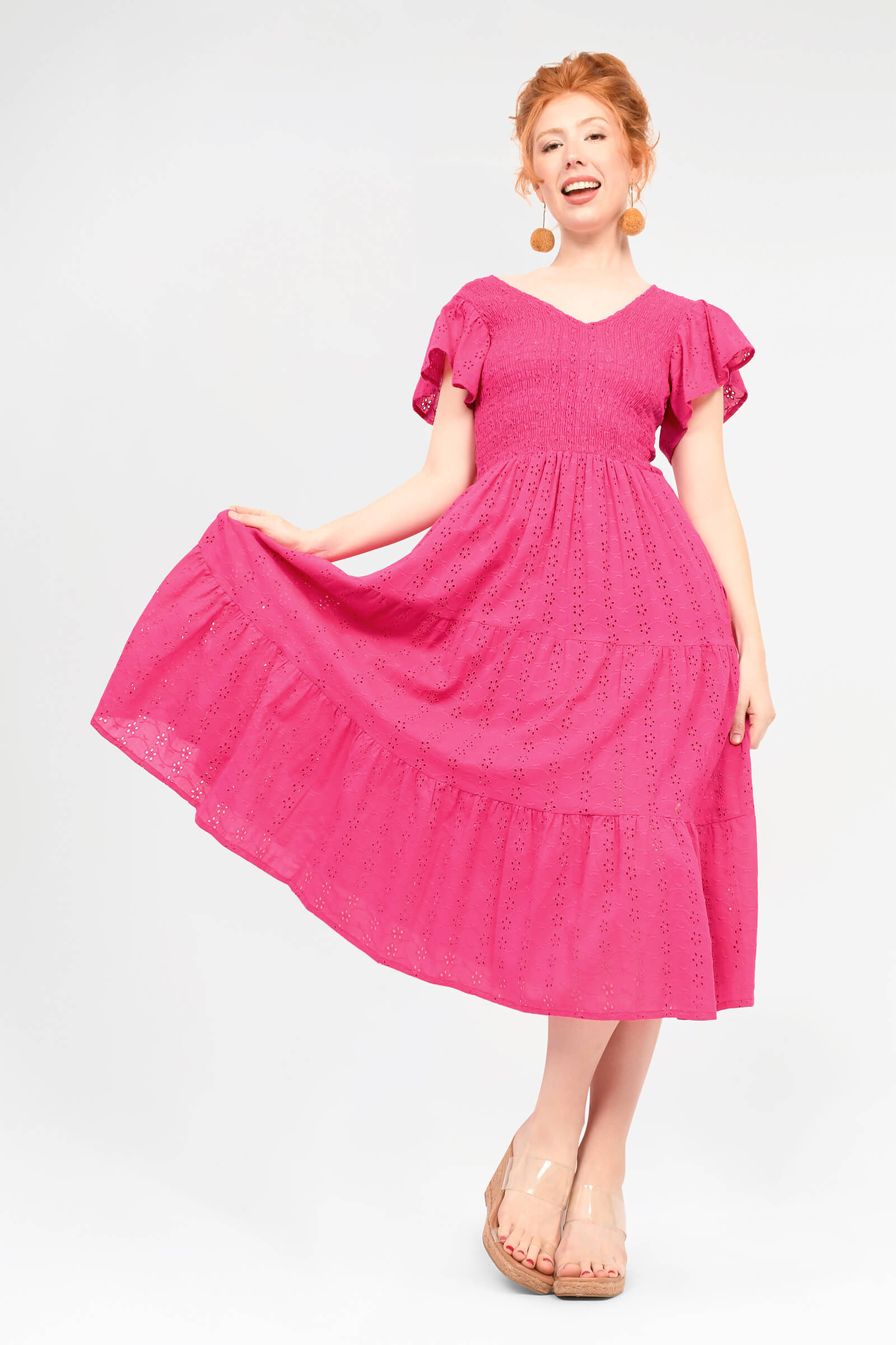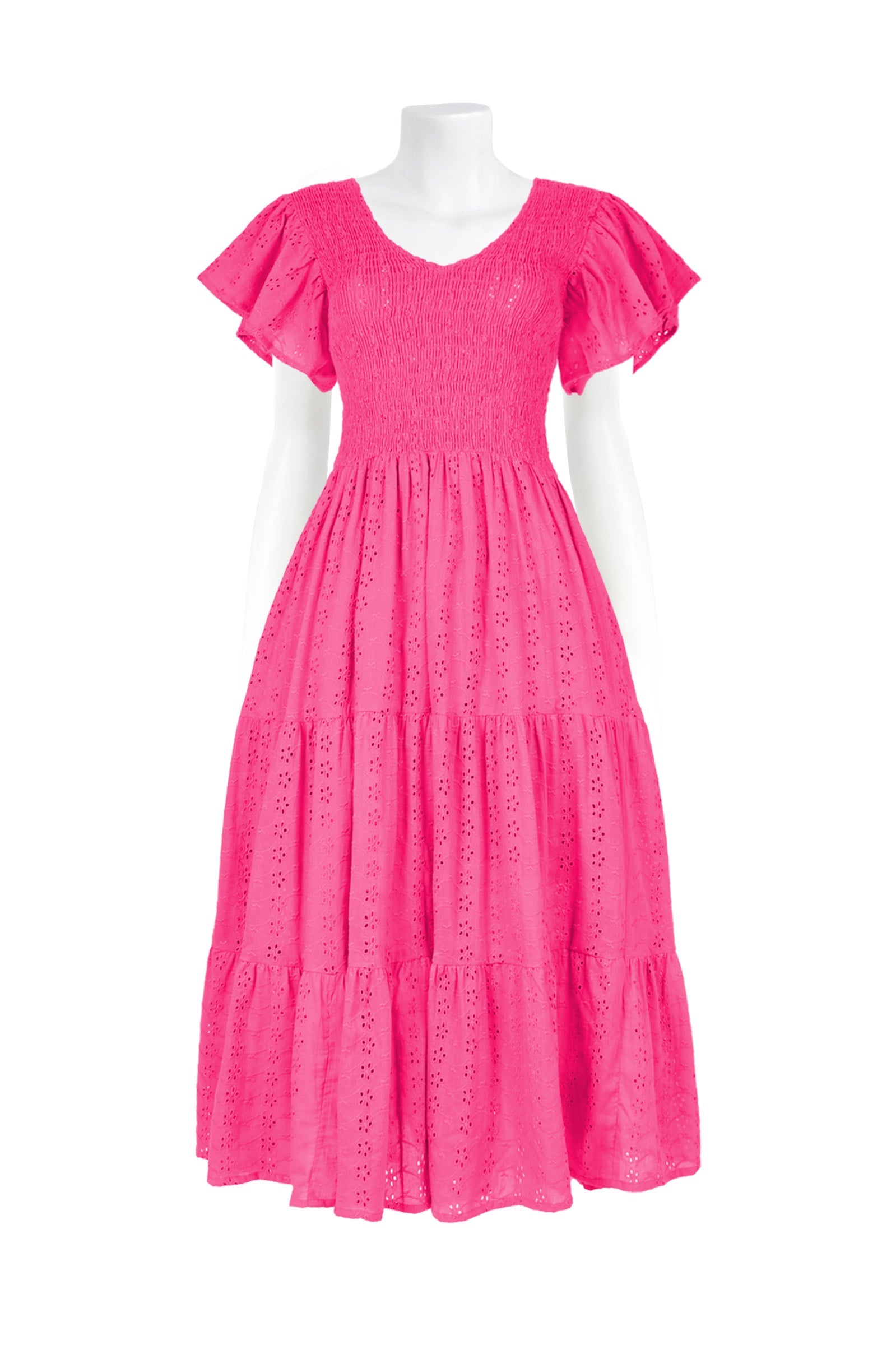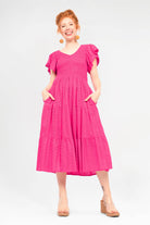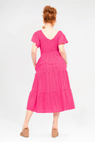 Featuring a gorgeous gently shirred bodice that meets 3 tiers and a falling gathered frill sleeve to die for! This stunning dress is available in 5 beautiful colours in our opulent Embroidered Cotton.