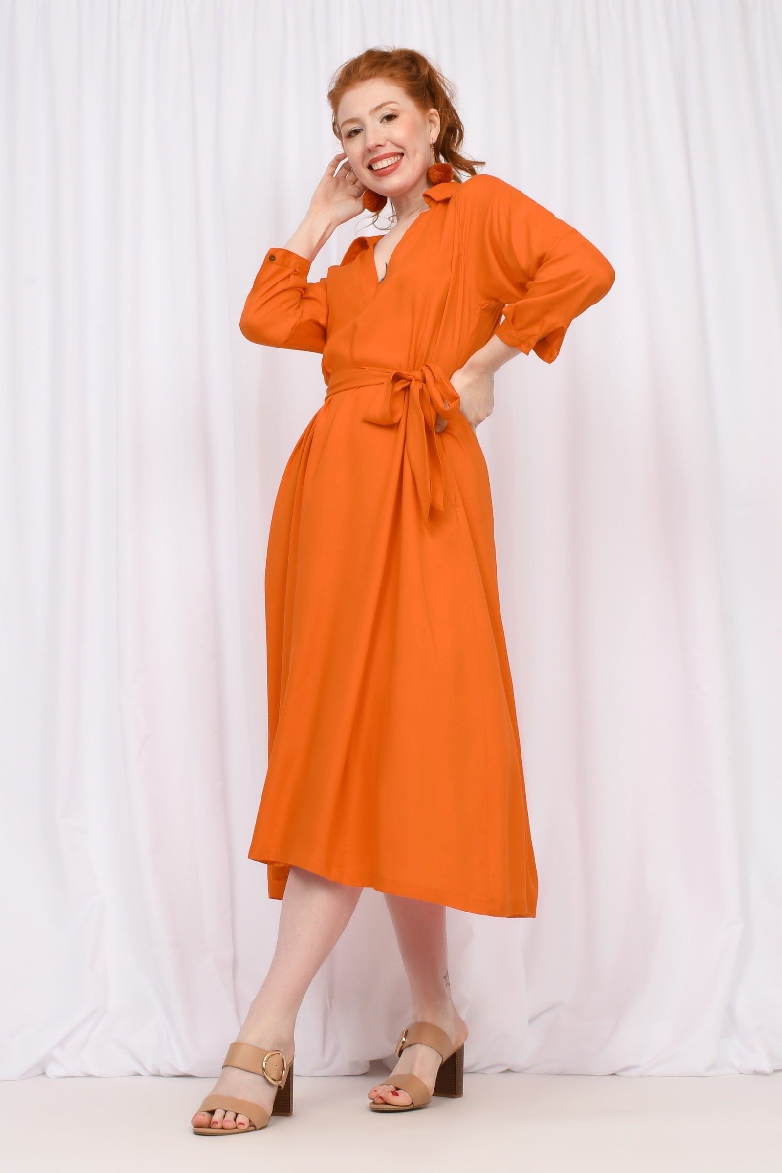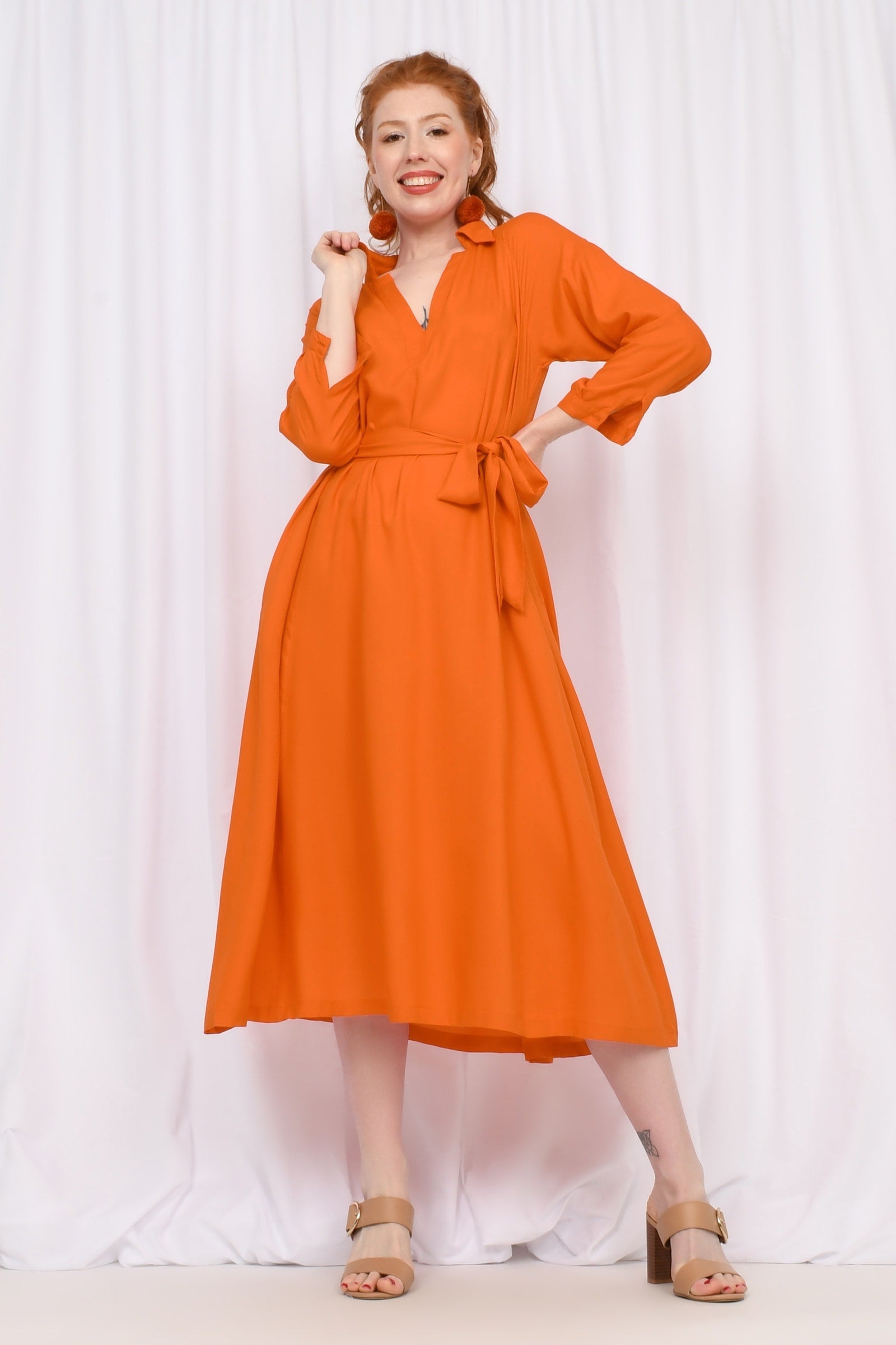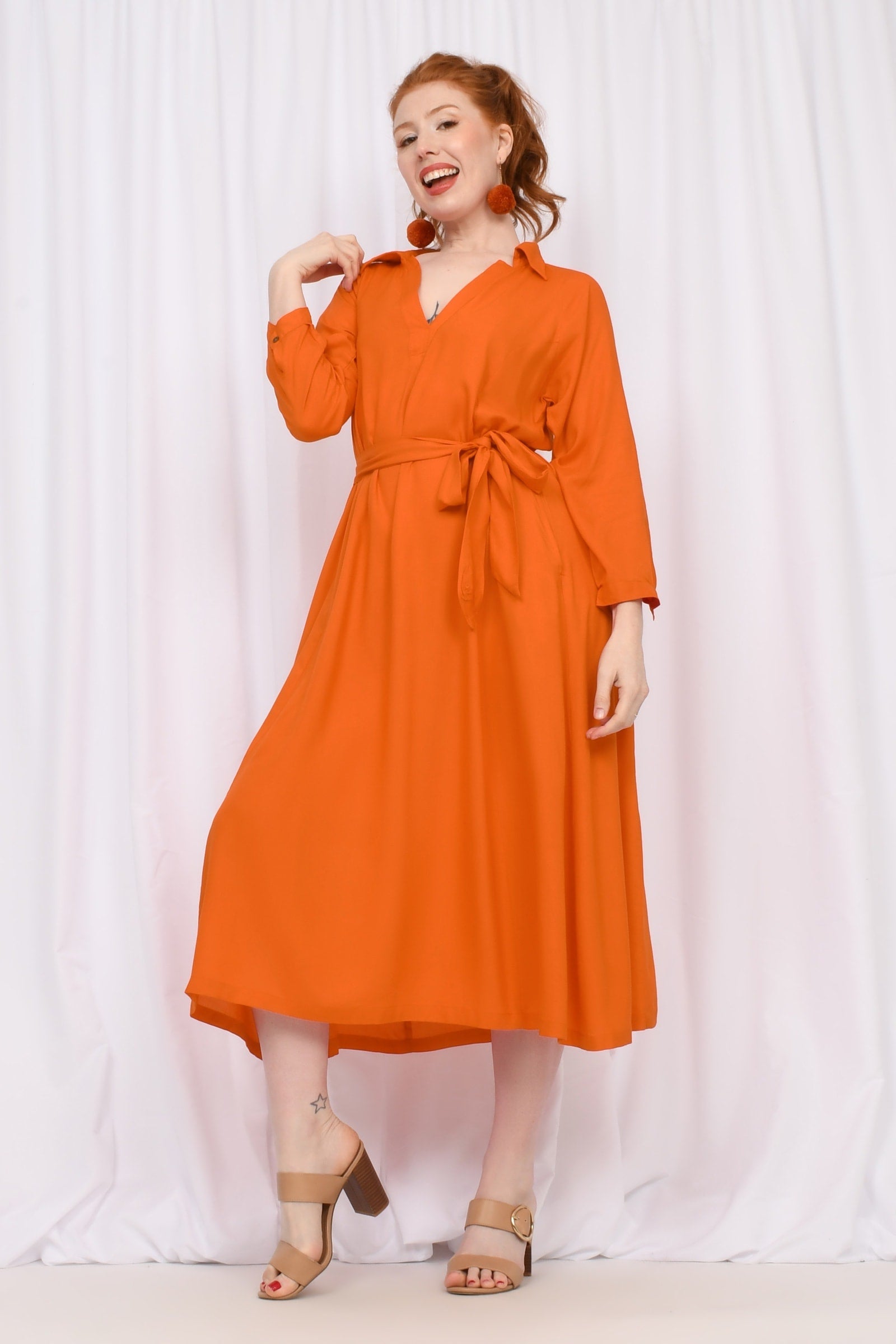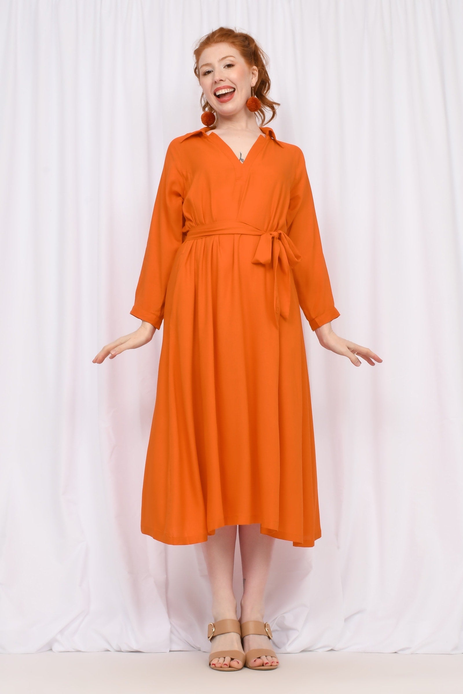Styling Tip - Cinch with the belt and add boots for a bold statement, or leave it loose with sandals for easy spring vibes. And don't forget your accessories with our Pom Pom Earrings in Rust to really complete the look!!