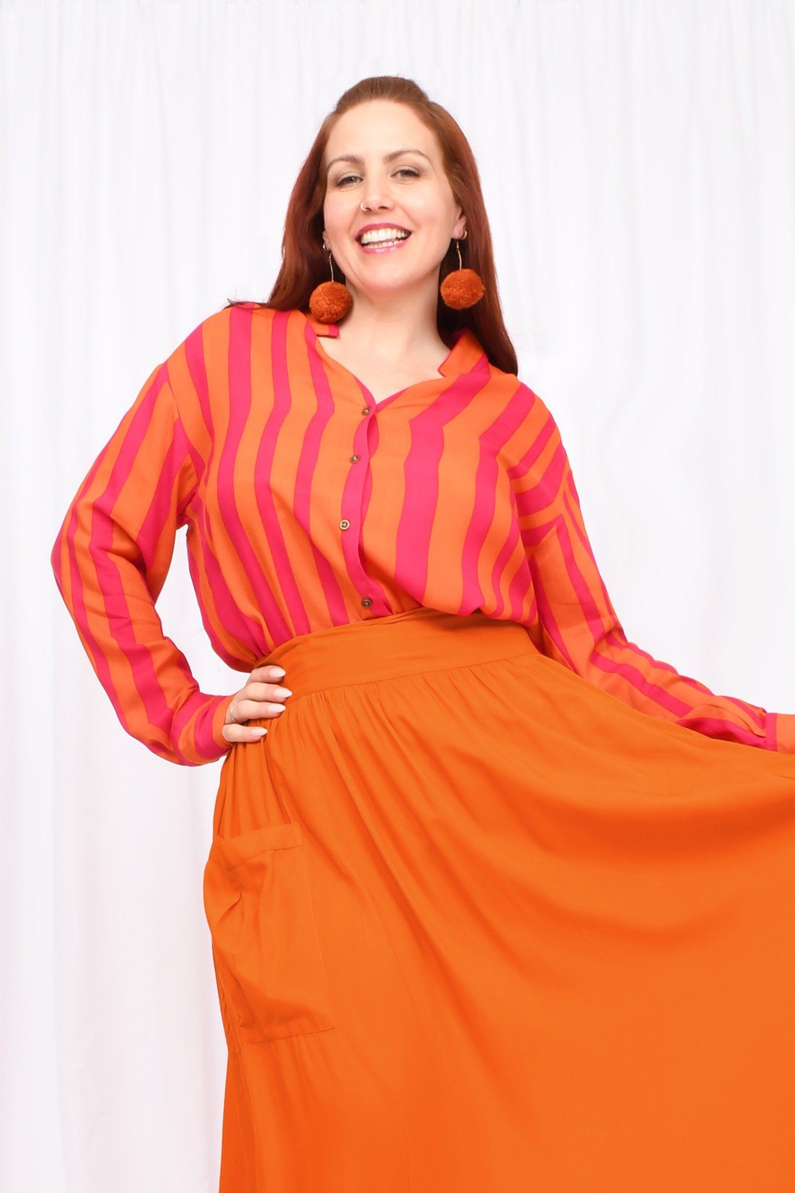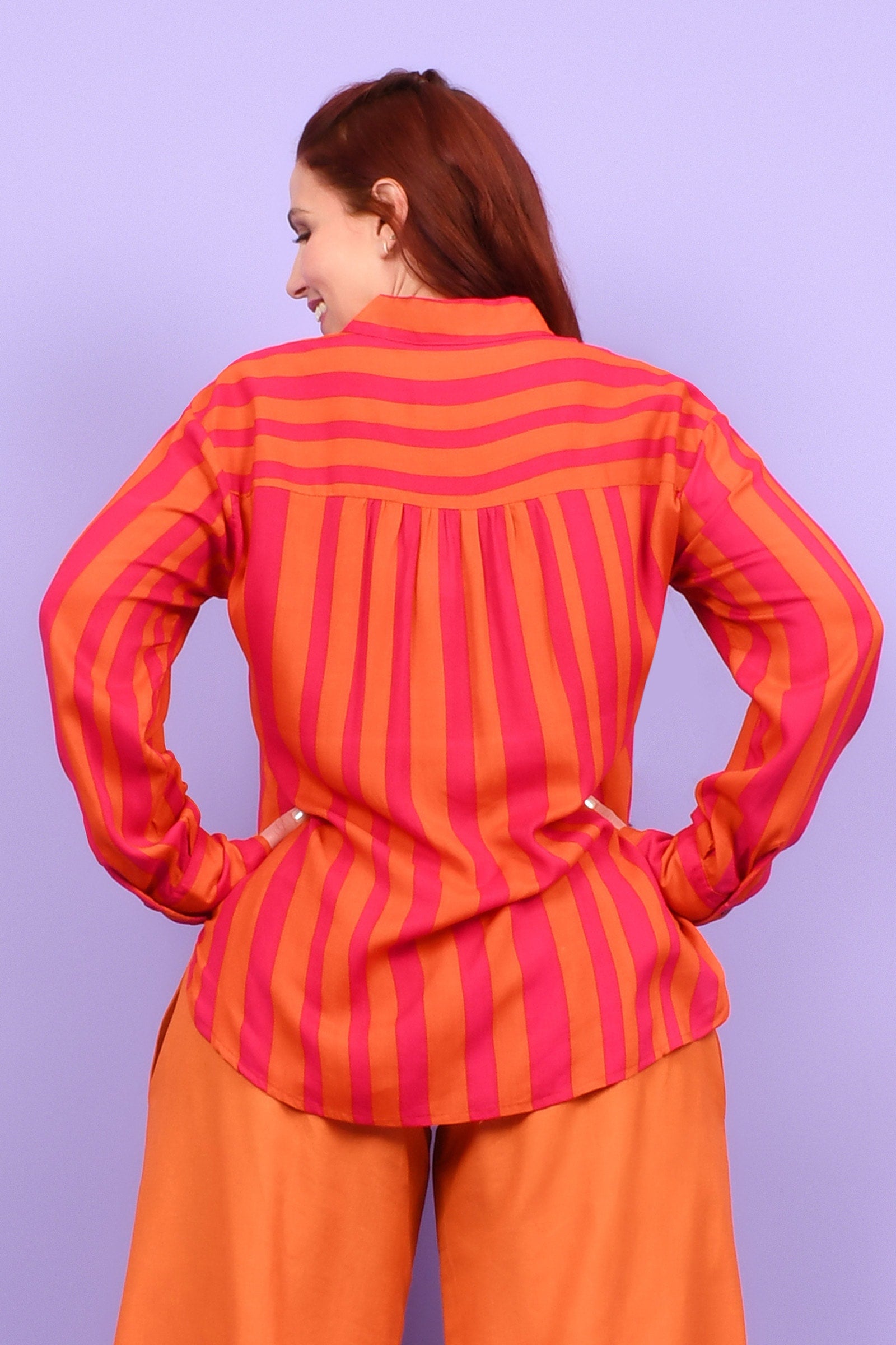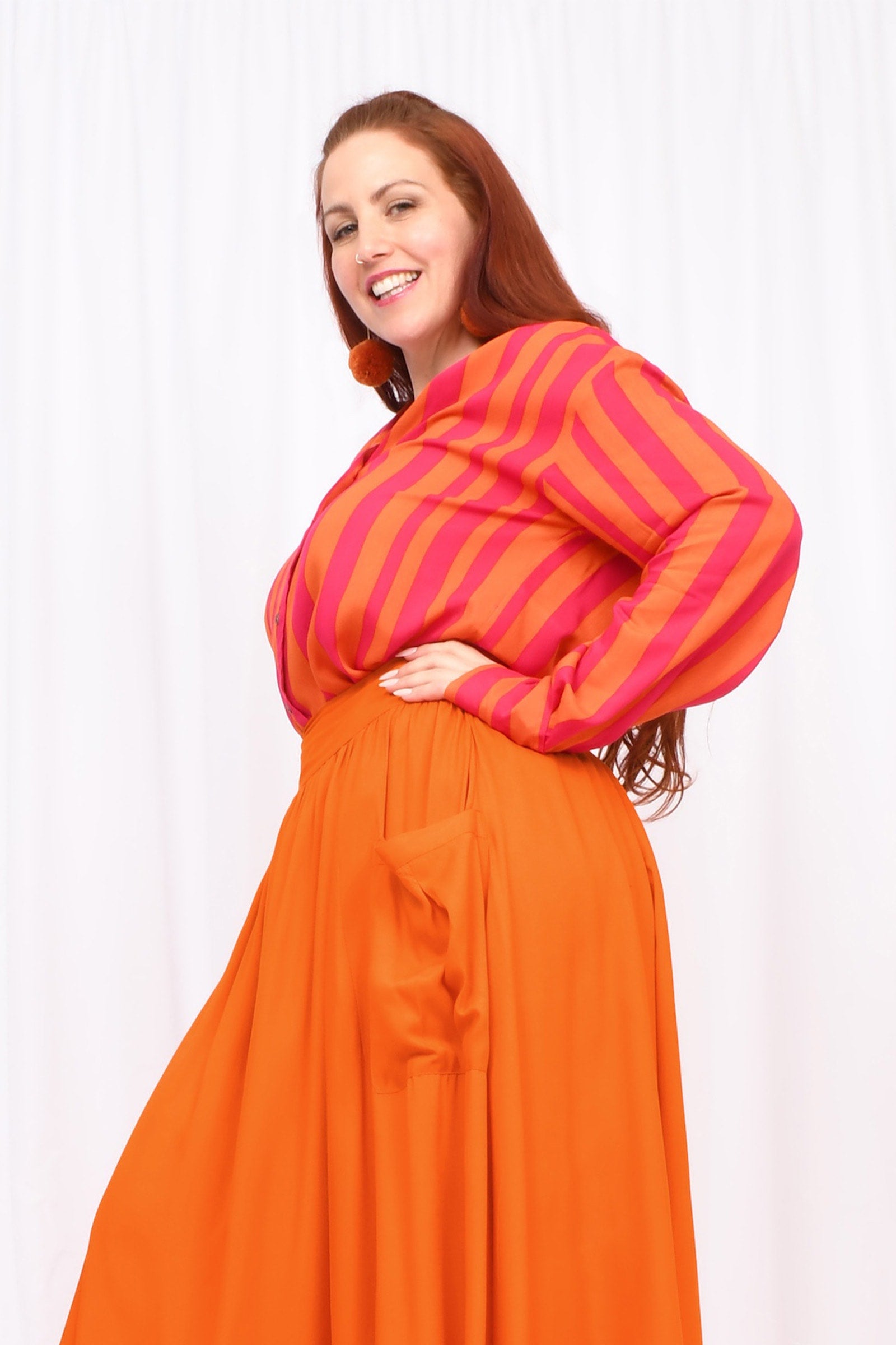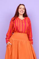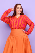 Styling Tip – Two ways to play! Keep it chic with our Ebony Midi Skirt or Sienna Long Pants in Marigold for a playful colour mix this spring. Or go all-in with a stripe-matching set by pairing your shirt with our Eloise Pants — an eye-catching combo!