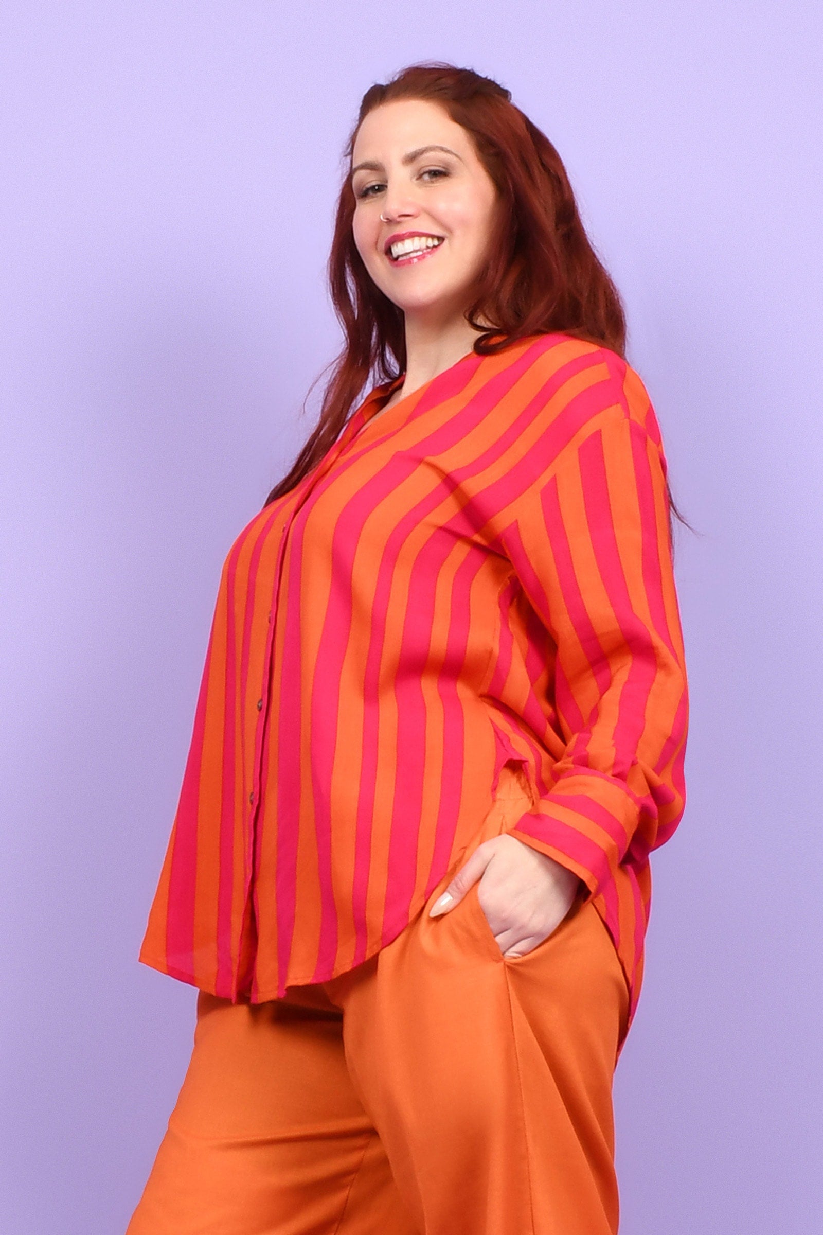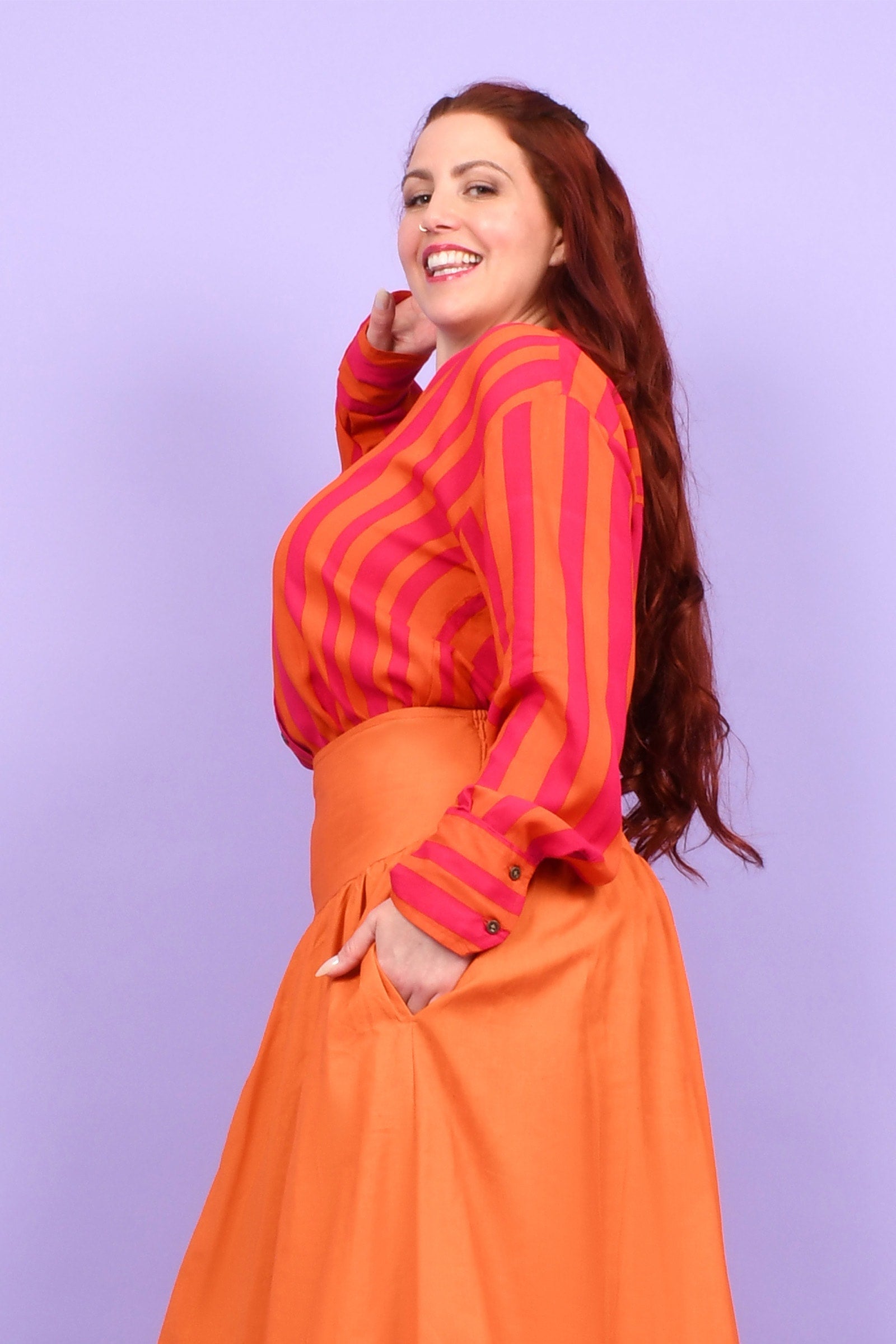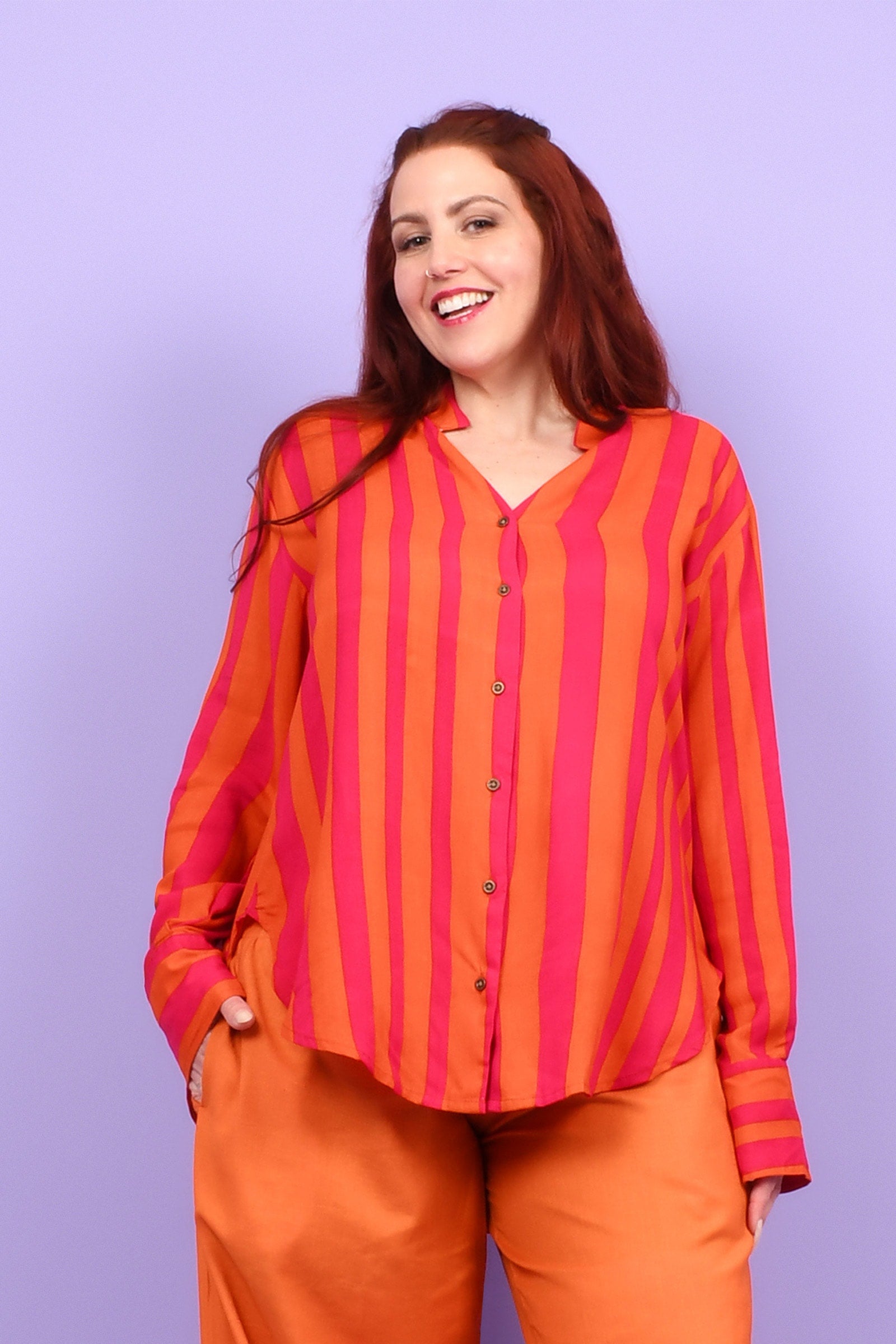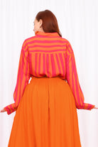 Styling Tip – Two ways to play! Keep it chic with our Ebony Midi Skirt or Sienna Long Pants in Marigold for a playful colour mix this spring. Or go all-in with a stripe-matching set by pairing your shirt with our Eloise Pants — an eye-catching combo!