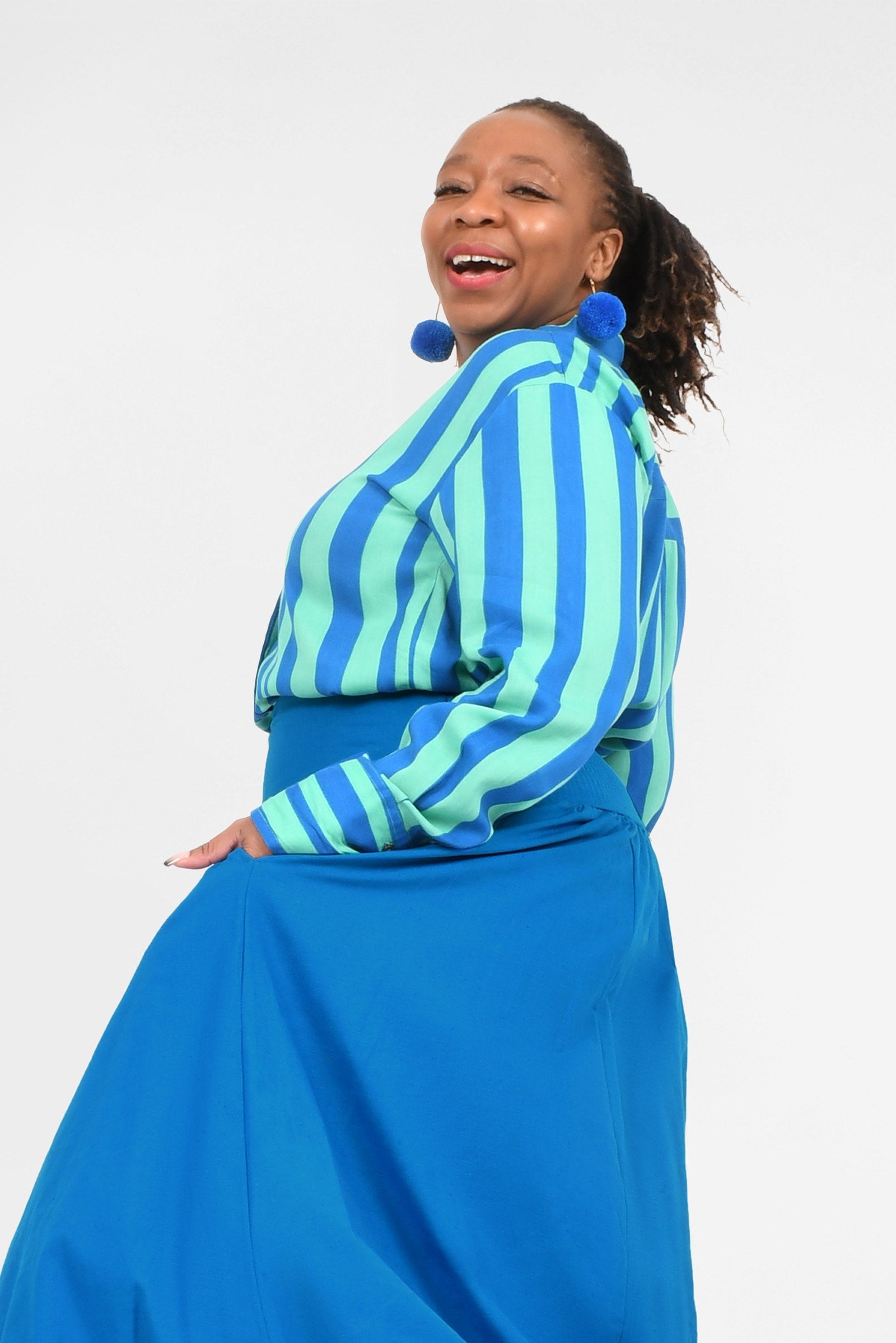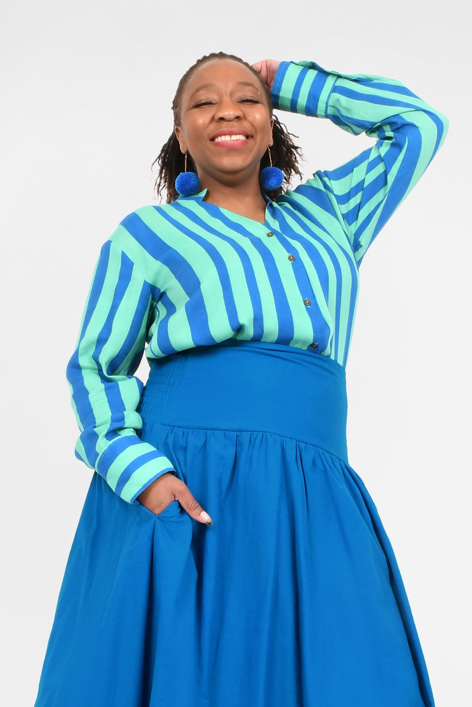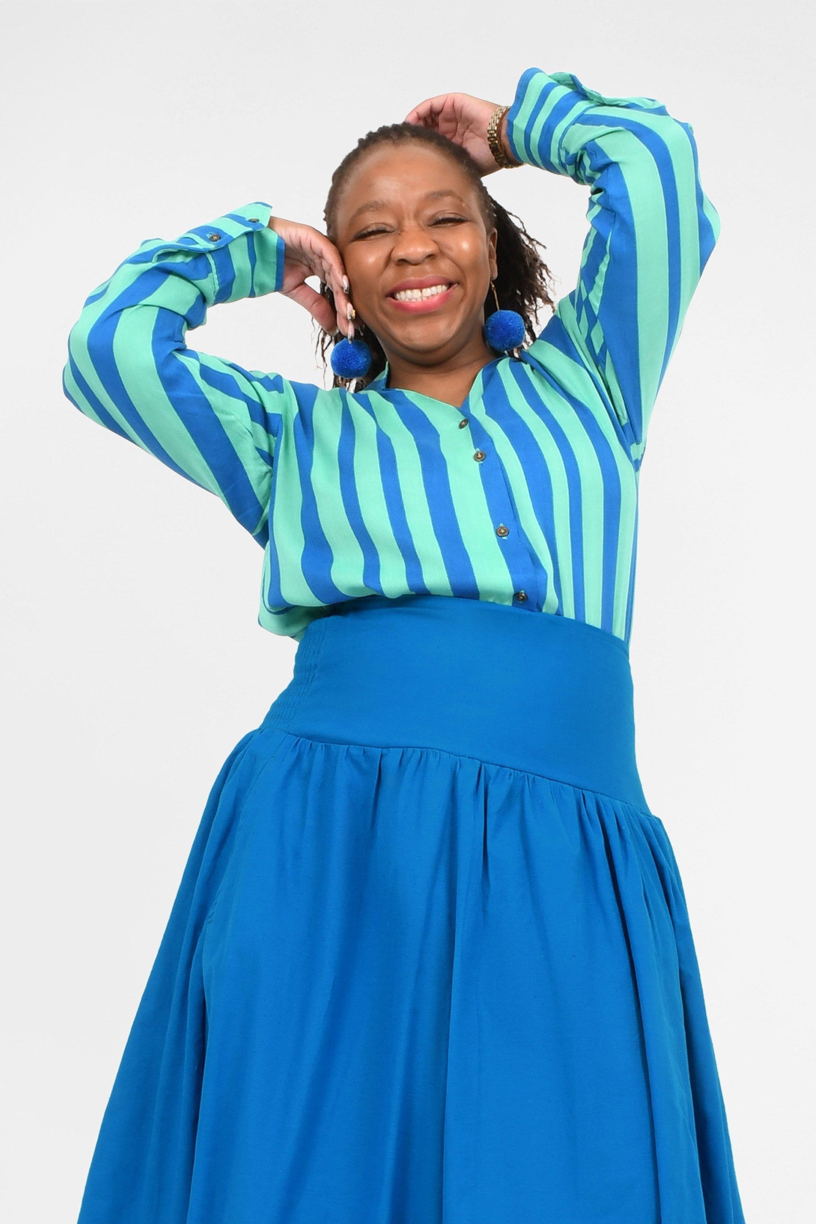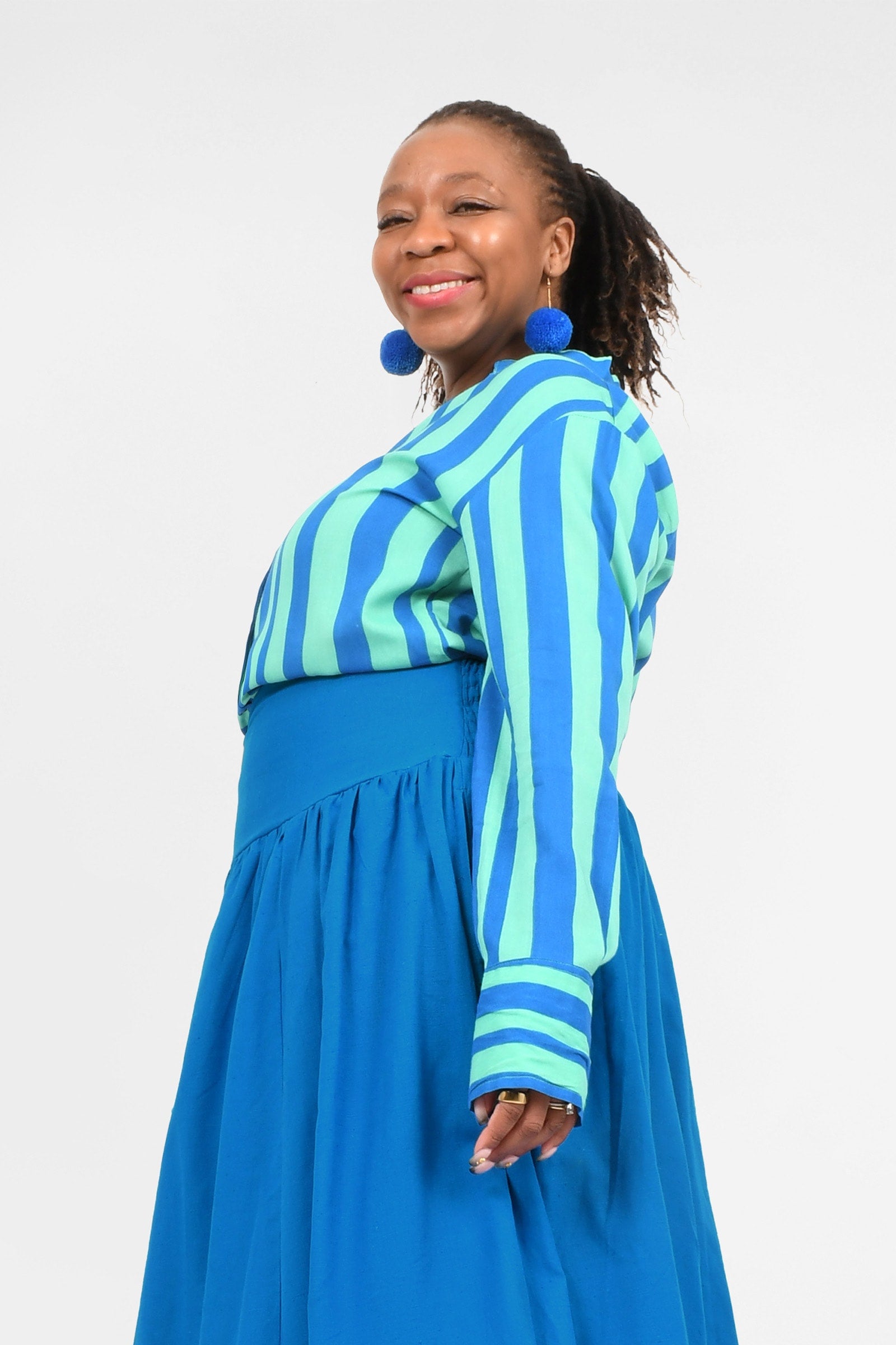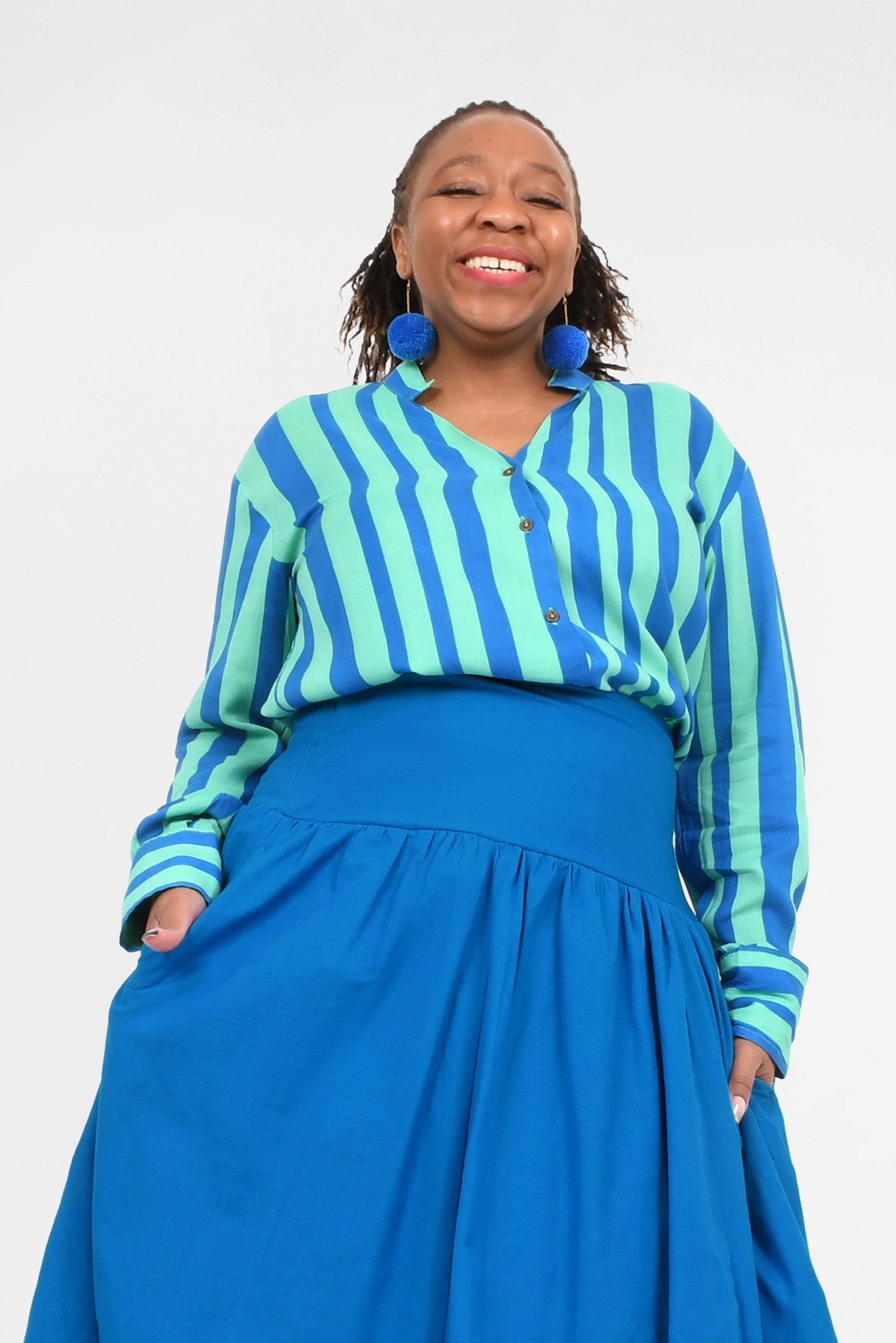 Styling Tip – Two ways to play! Keep it chic with our Ebony Midi Skirt or Sienna Long Pants in Cypress for a playful colour mix this spring. Or go all-in with a stripe-matching set by pairing your shirt with our Eloise Pants — an eye-catching combo!